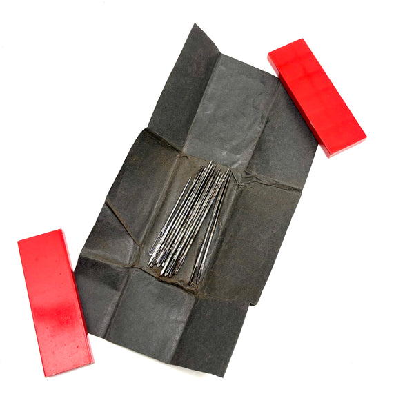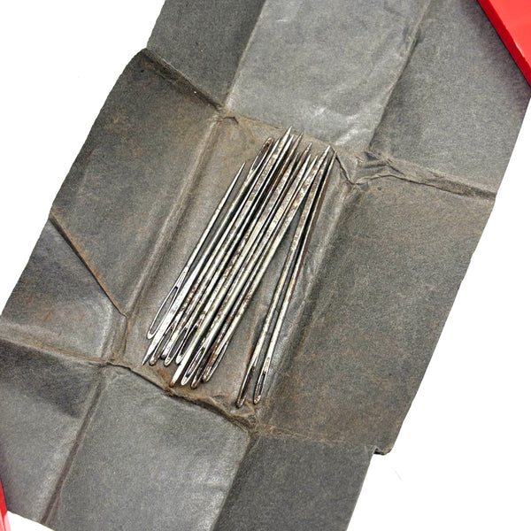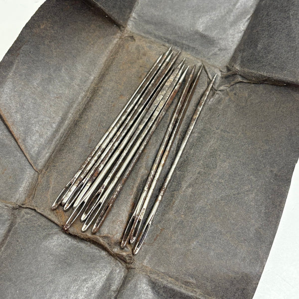 As folded: 3 1/8" x 1 5/8". 11 needles included. A few tears to the gray paper along fold lines, and a little rusting to a few of the needles, but overall very good antique condition and a rare one.