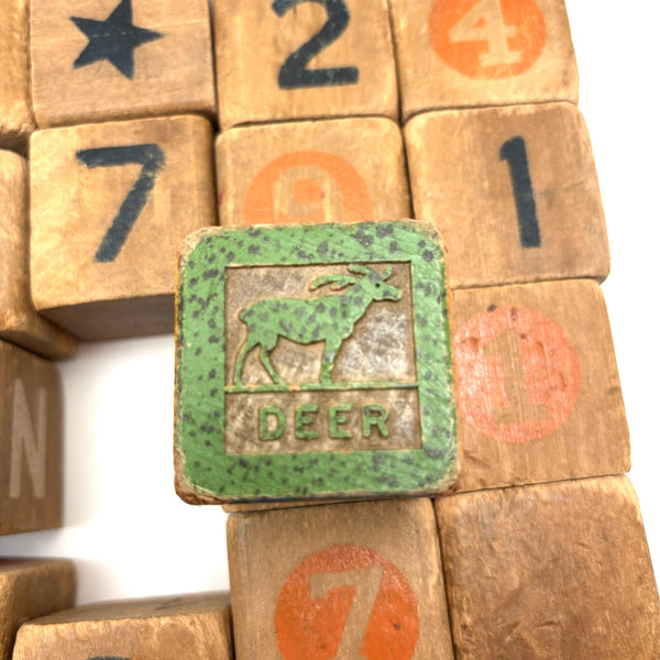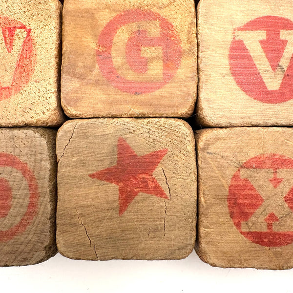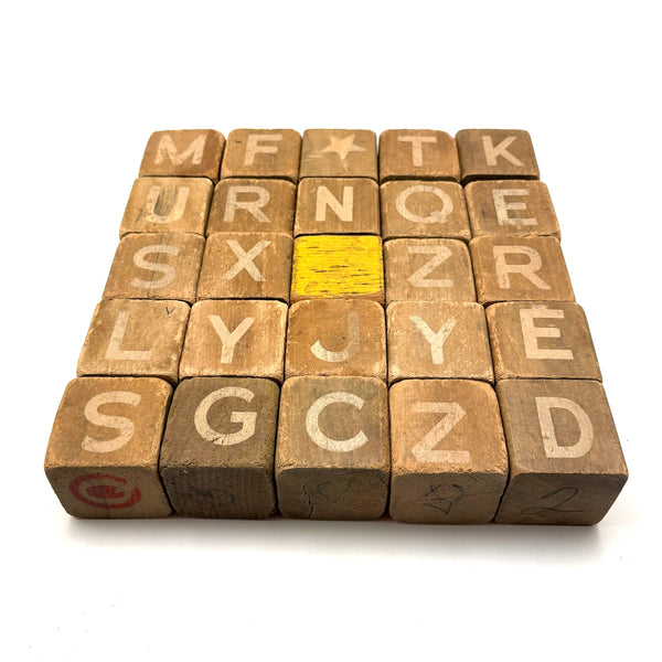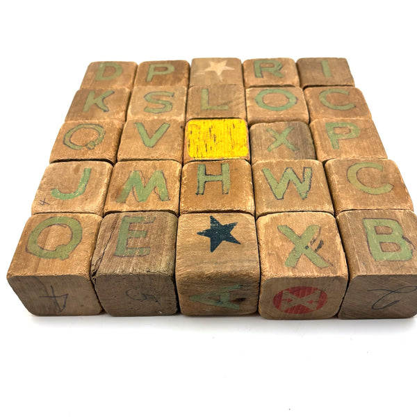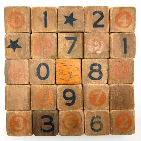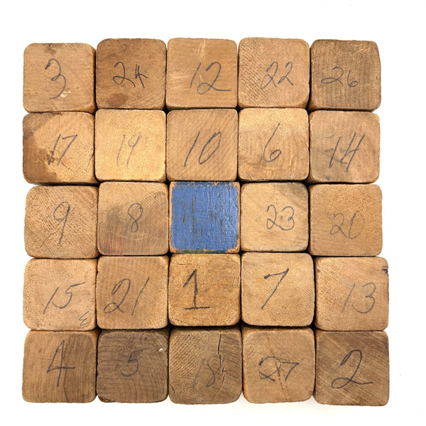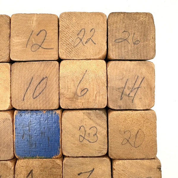 Set of 25 (24 matching one odd shown at center) All about 1 3/4" square. Well worn in the best of ways, as pictured, but no notable losses to the wood. C. 1920s-40s I would guess.