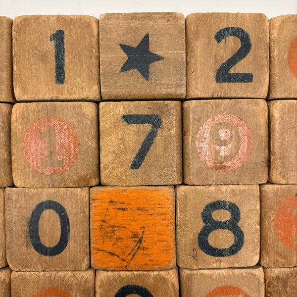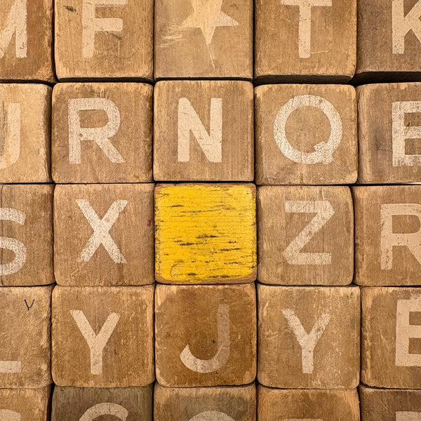 You know I love blocks, but I look hard for singular and special ones, and this set is definitely that for me. It is most of all the sides with mossy green painted letters that sold me--with those letters looking hand-painted, or at least hand-outlined in graphite, and done in my favorite sort of wonky and wavering sort of way. But the rest of the sides are very good too, with the white letters, which look stamped or stencil painted to me, placed anywhere but dead center of the square. And then another side with hand-written numbers, and another of letters inscribed in red circles, and soft blue pictures, and more. Plus a handful of excellent stars. And with the 25 block, which I've photographed at the very center, unmatched to the rest of the set--but with solid painted sides in blue, yellow, orange and red, I think it provides the perfectly complement/punctuation mark to any arrangement.