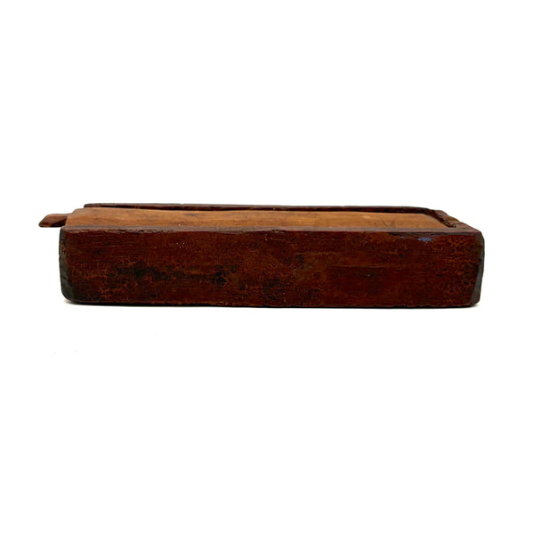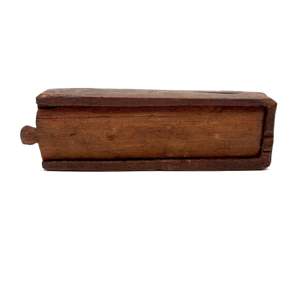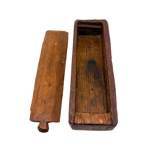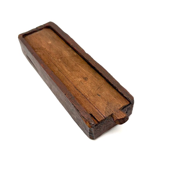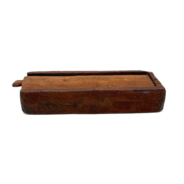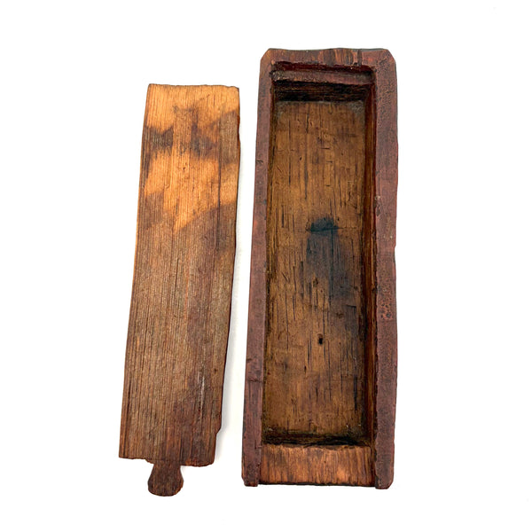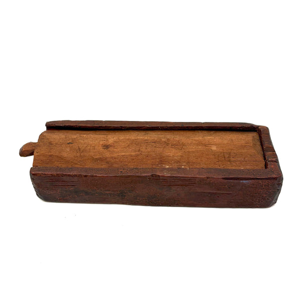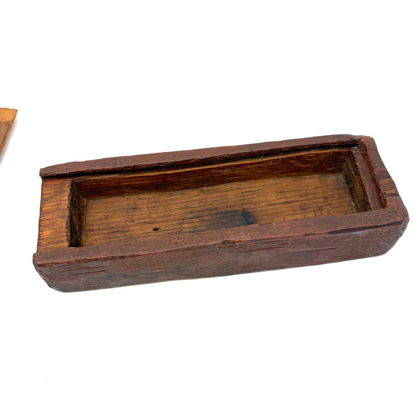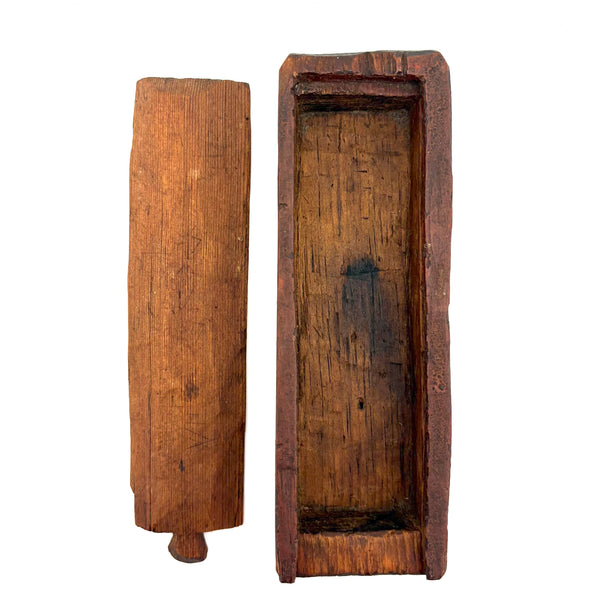 I really love an old carved out wooden box. Feels so visceral and direct, not messing around with jointed corners, just digging out the inside. And this old one with a sweet little carved knob at the end of the sliding lid. Could be that the unpainted pine lid replaced an earlier one, but if so has been with it for a very long time, lovingly done and perfectly fitting. Perhaps made to hold slate pencils, but good for whatever little odds and ends now, and a nice one for the top of a stack. With old red paint/stain on the box itself and and a warm dry patina to to the slide lid. Humble and honest, super warm presence, teeming with labor and love.