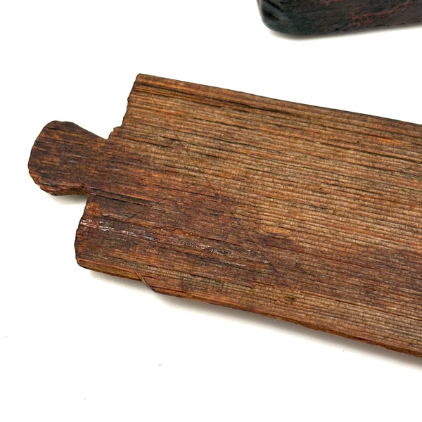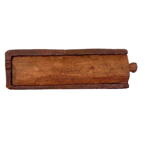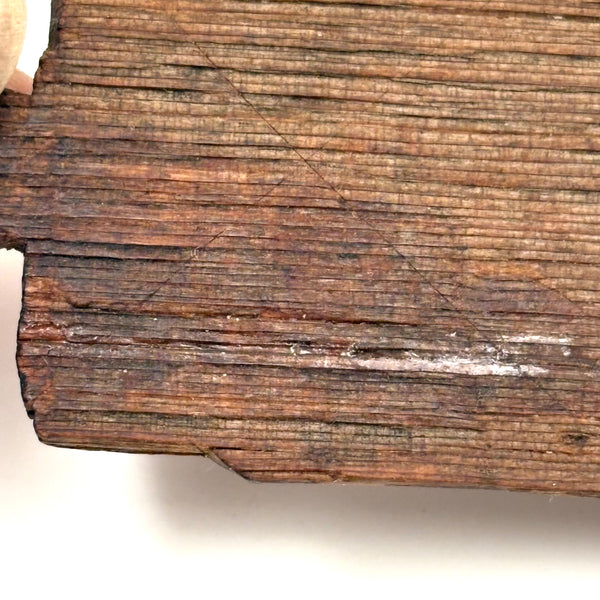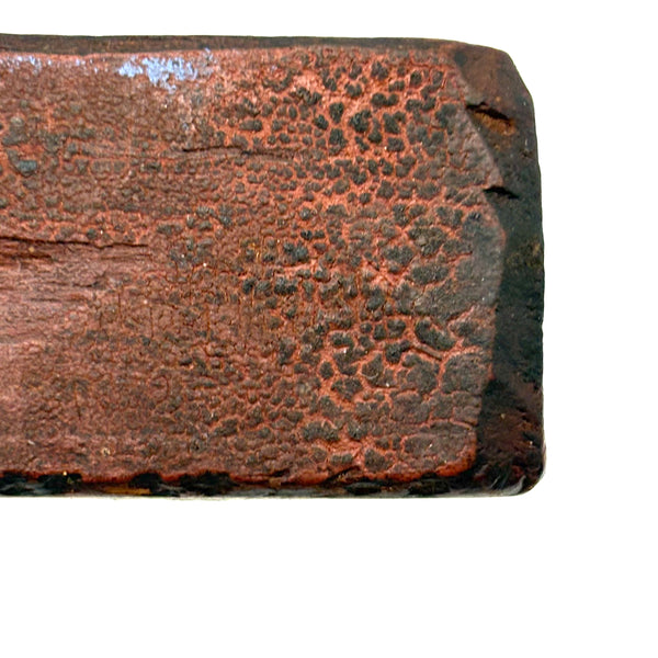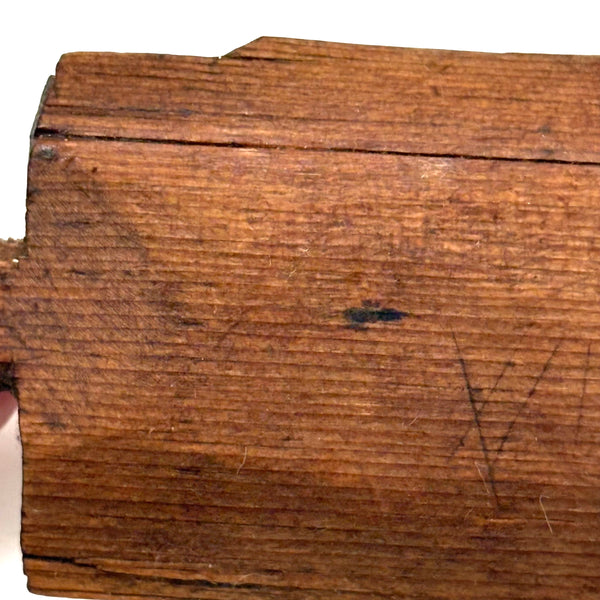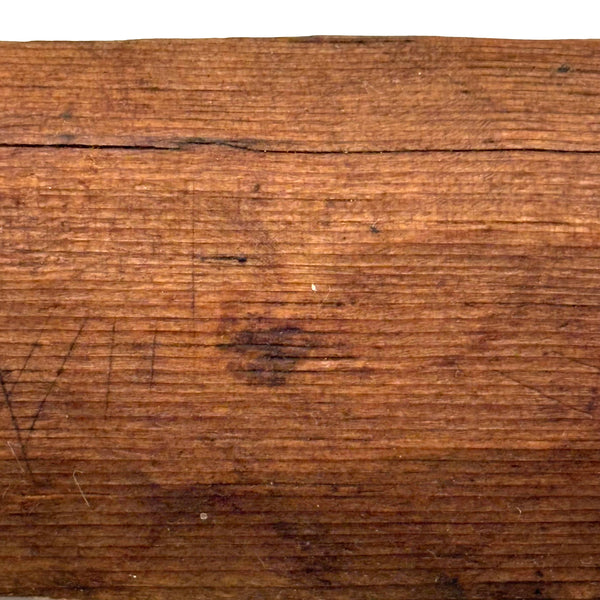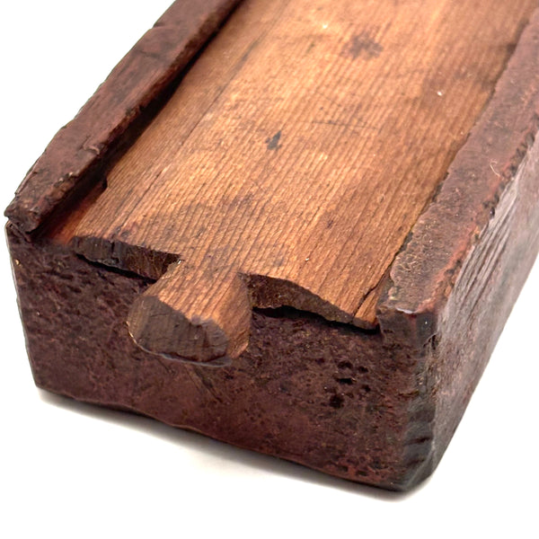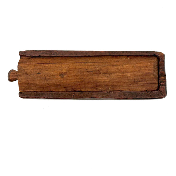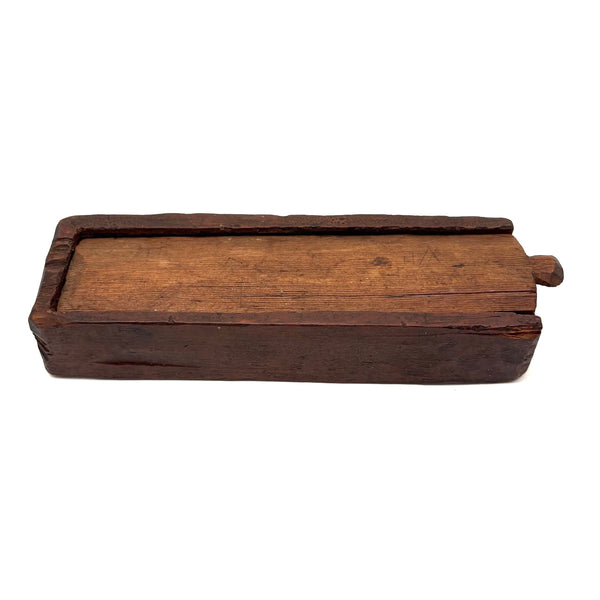 I really love an old carved out wooden box. Feels so visceral and direct, not messing around with jointed corners, just digging out the inside. And this old one with a sweet little carved knob at the end of the sliding lid. Could be that the unpainted pine lid replaced an earlier one, but if so has been with it for a very long time, lovingly done and perfectly fitting. Perhaps made to hold slate pencils, but good for whatever little odds and ends now, and a nice one for the top of a stack. With old red paint/stain on the box itself and and a warm dry patina to to the slide lid. Humble and honest, super warm presence, teeming with labor and love.