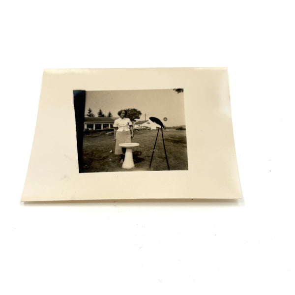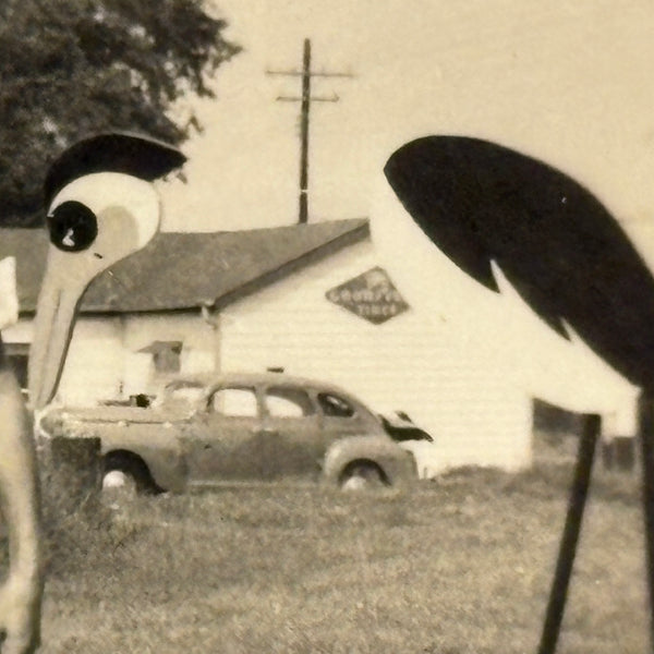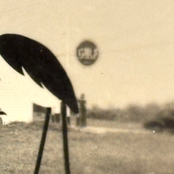 A fun little one, which I liked formally at first glance, and like even more upon close inspection, as one sees that our woman--standing in front of bird bath and looking pretty game herself--has a stork companion, with the gulf gas station in the distance filling the gap between the stork's head and body. Super imposed, or is the head of the stork actually attached to the roof of the station, with the car beside it pulled right up to the tip of the beak? Nicely surreal, and with an excellent rake to the left edge of the photo.