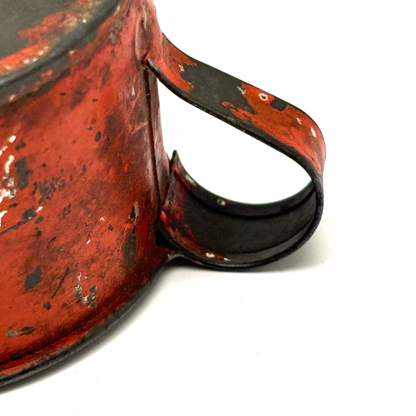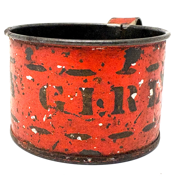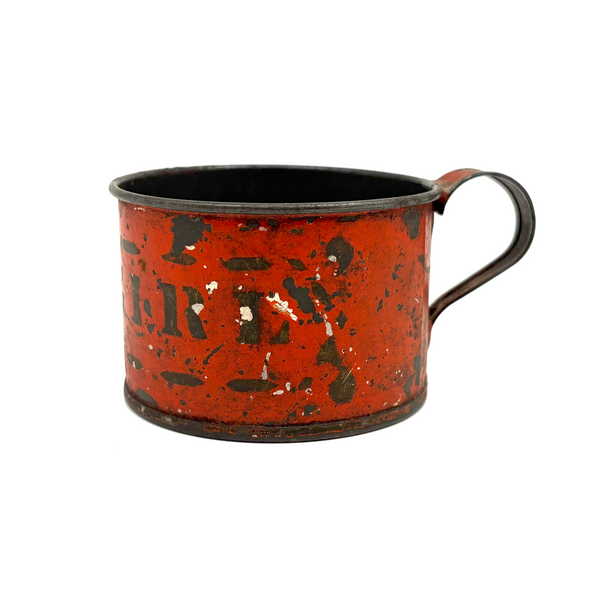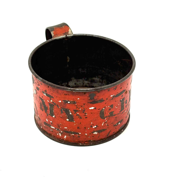 The perfect valentine for one's favorite girl. There is really no better red than the red of this paint as it shows on tin, either. Mid 19th century, with stencil painted lettering; decorative dashes above and below, and a terrific patina. A really charming example.