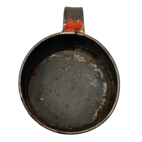 2 3/4" d x 3 5/8" across at handle x 2" t. General wear to the paint showing spots of silver beneath. And with the paint perfectly worn away at the top of handle from being held.