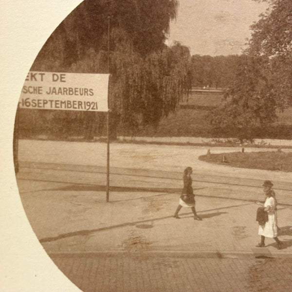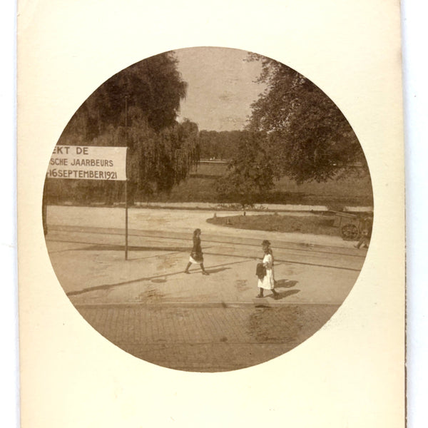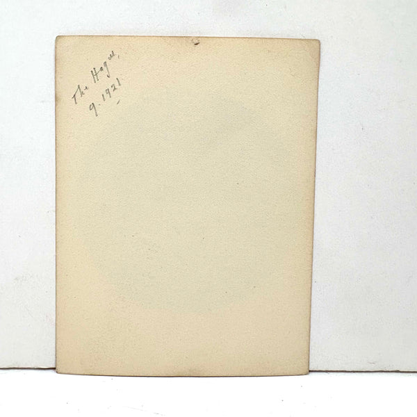 I presume this was taken with an early Kodak camera (invented 1888), which produced round images, which I am personally obsessed with, especially for how the circular format makes everything seem as is viewed through a scope--and so all about watching, from some degree of remove-- i.e. voyeurism, and in this case feeling very much like surveillance. (This image was printed directly on card, rather than mounted to a Kodak mount, which is what one usually sees, so I'm not completely sure, but whatever the case, the effect is the same.) I love when vernacular photography and conceptual art converge, and this image, with solitary woman on the street in coat at dead center seeming very much the subject, makes me think of works by everyone from Sophie Calle to Vito Acconci to Jill Magid. And also, very much, Hitchcock. The drama is in the watching, the imagining, the mystery and the projected narrative. And in this case the simple notation on reverse, "The Hague, 1921," feels just right--global hub of international law and arbitration, the name of which Den Haag (anglicised as The Hague) derives from the Middle Dutch word hag(h)e, meaning "enclosure", or "hunting ground"--and which seems just the sort of city for tracking undercover agents through scopes!