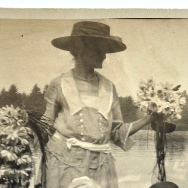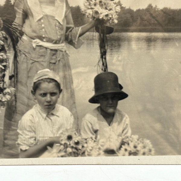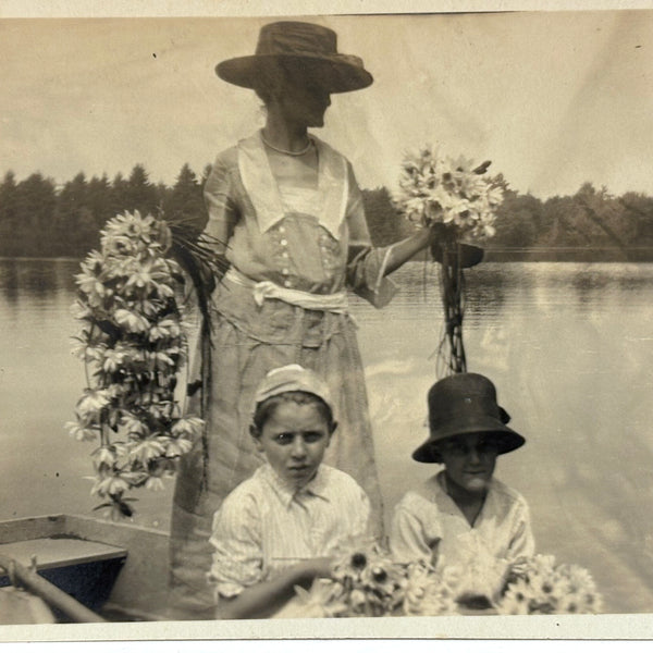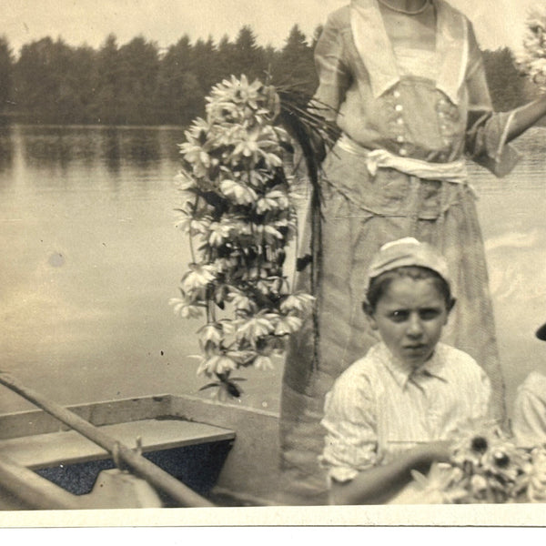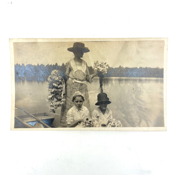 Woman and Children on Rowboat Holding Waterlilies, Poetic Antique Snapshot Photo