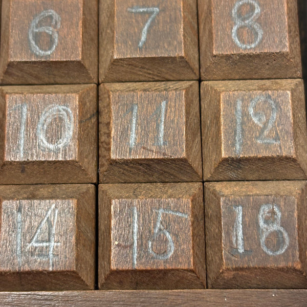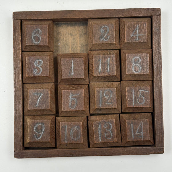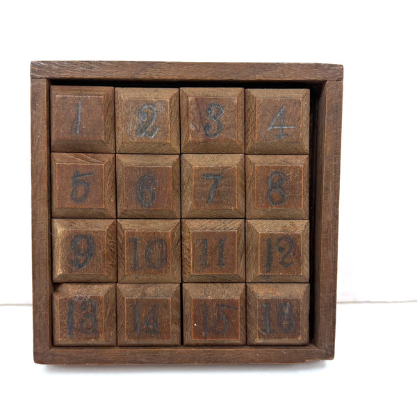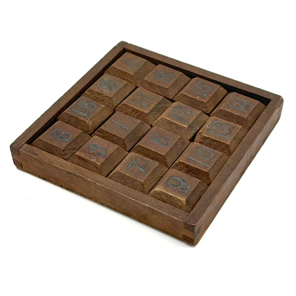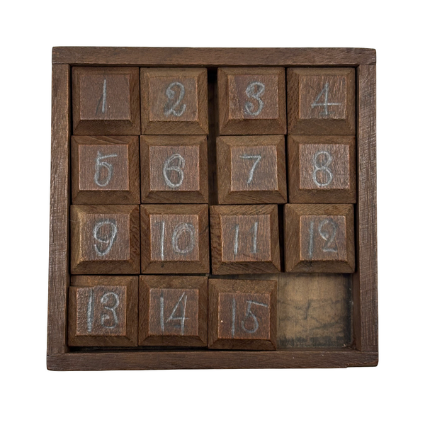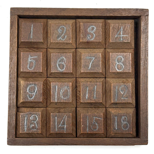 I just like these old 15 games, with blocks that one is meant to mix up then slide around to get back in numerical order. Simple and slow and tactile. This one with handwritten number in graphite--looks perhaps as if written over at some point, I presume because the earlier ones had worn pretty well away. Funnily, the extra block, or plug--which must be removed in order to play--is numbered 18 rather than 16, suggesting perhaps a misread of the original number, and lack of logic in figuring it out! I like moments like that. Walnut I believe, with nice finger joints at the corners of the tray the carved tiles sit in.
