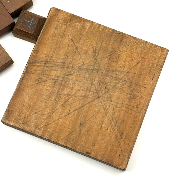 3 1/2" x 3 1/2" x 1/2". Very good antique condition. Walnut I believe. One small nick to the surface of the wood at one corner, as documented--minor and really only visible if looking for it.
