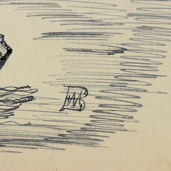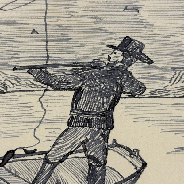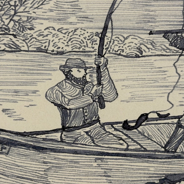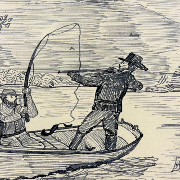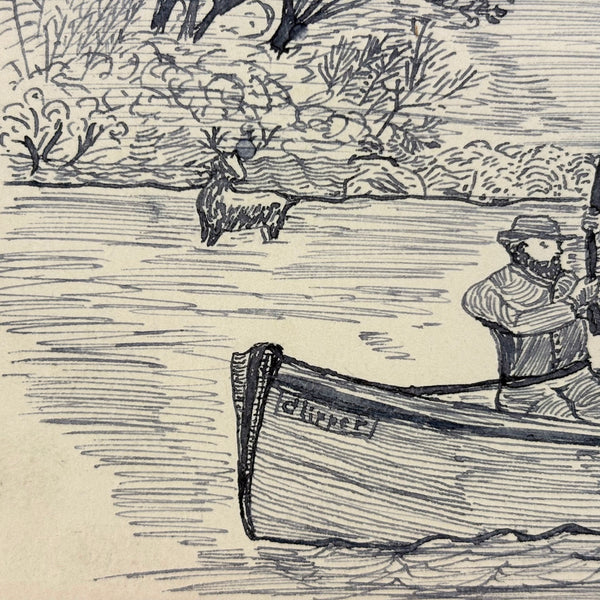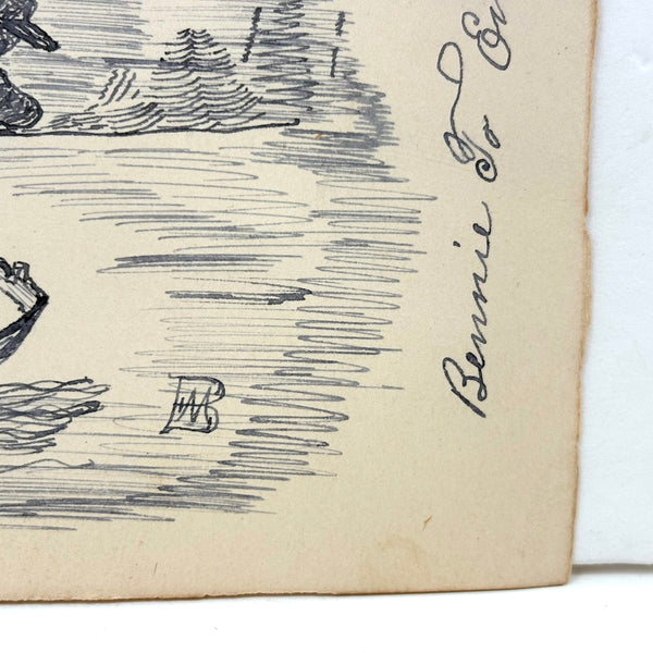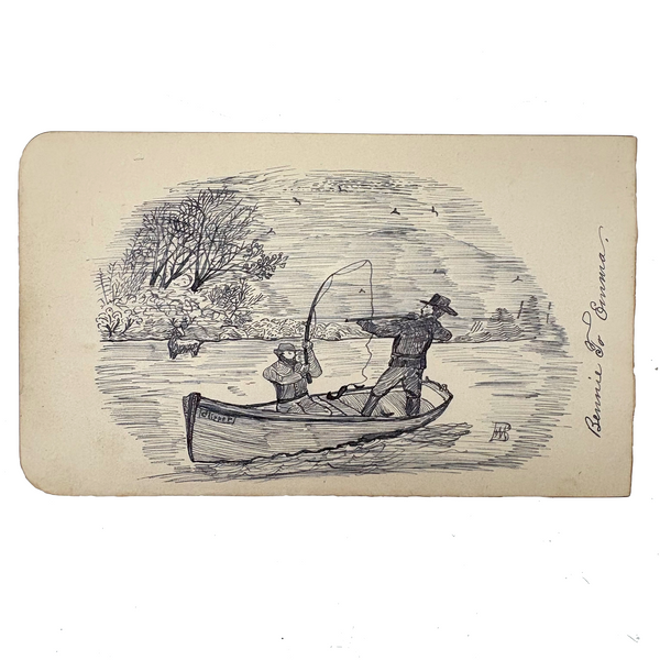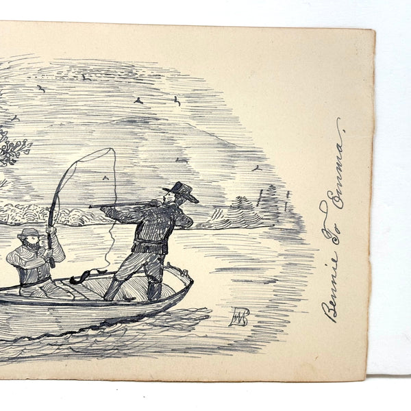 If I were this fisherman, I might get out of the way! I really like this ink drawing for the manner of it, with the rendering of the bearded fisherman especially good (terrific use of line), and I also like it for the sense of these two hunters being at cross purposes, and maybe soon to tip over while that deer runs off into the woods. Late 19th century I believe, from Bennie to Emma.