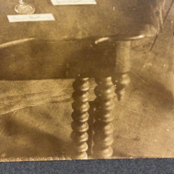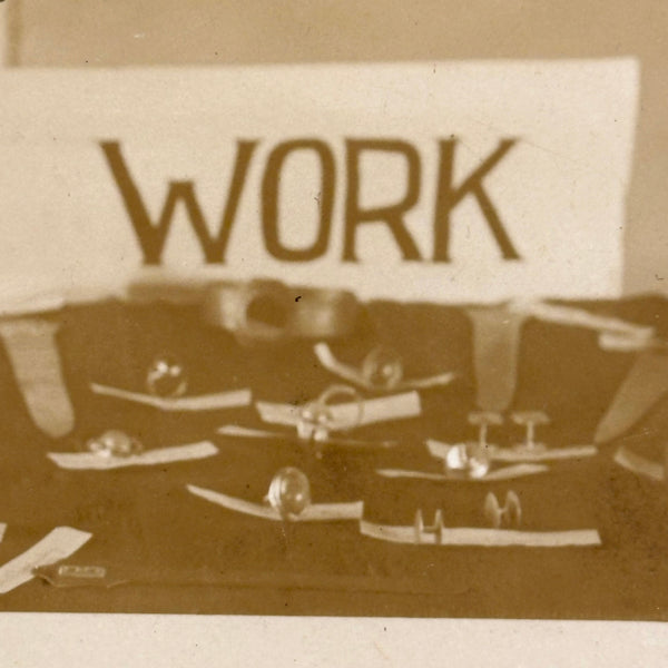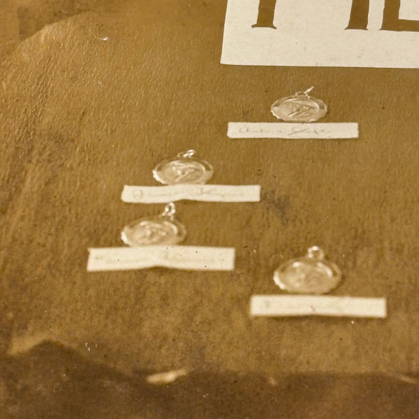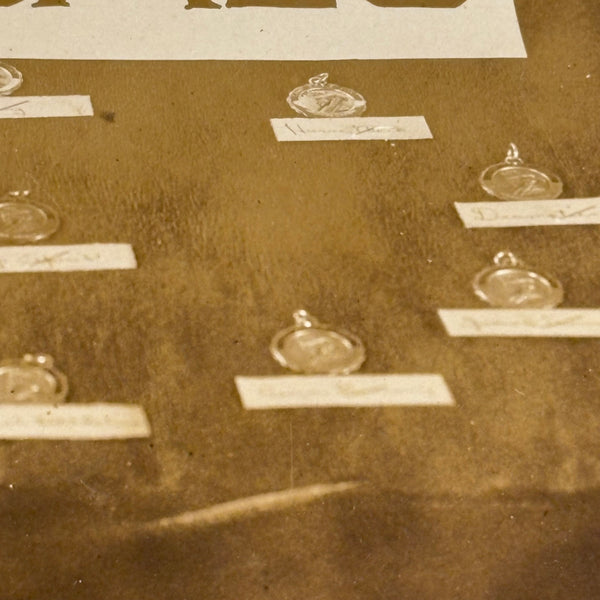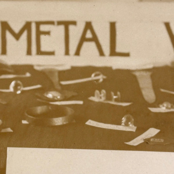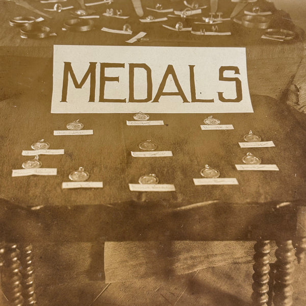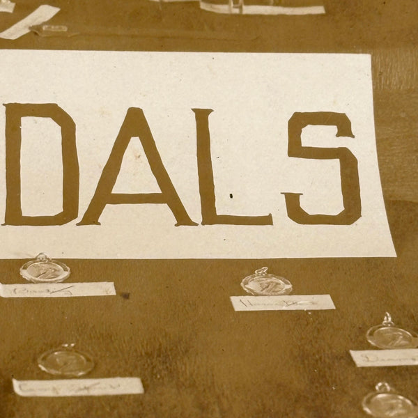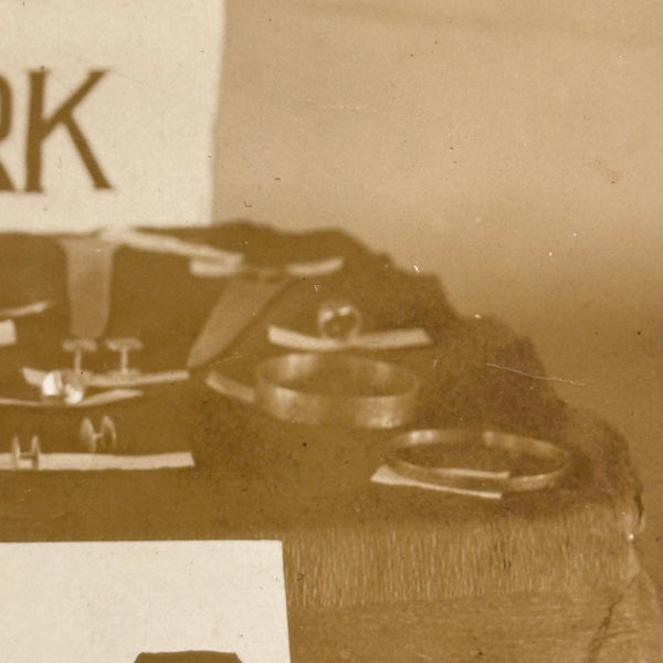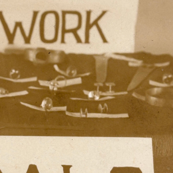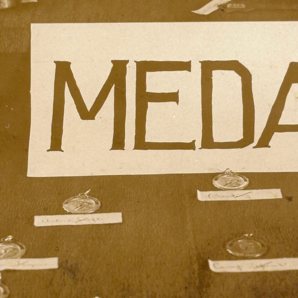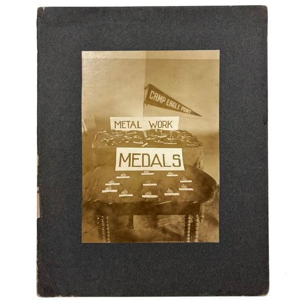 This makes me very happy. Medals for metals. And it looks like pretty much everyone at Camp Eagle Point was going to earn a (metal) medal for their completed metal work! The large signs sitting on the tables were carefully hand lettered, and looks like there is a bit of paper under each medal with a campers name handwritten on it. And then the camp flag hanging at a perfectly rakish angle on the wall behind. This looks like an albumen photo to me, mounted to dark gray card, and would pop a lot more with a white mat framing the photo.