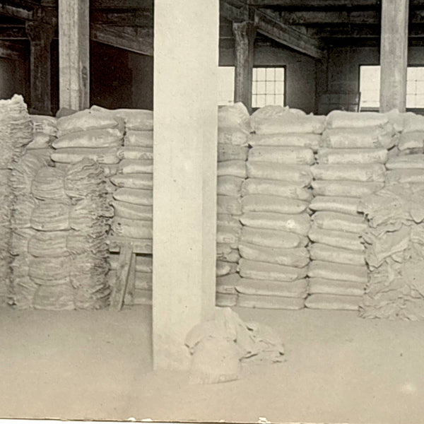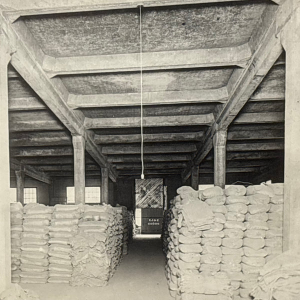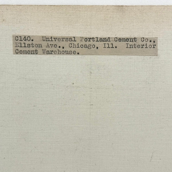 9 1/2" x 7 3/8". A silver print I believe, mounted to linen. Typed label on reverse identifies it as the Universal Portland Cement Co., Interior Cement Warehouse, Ellston Ave, Chicago (which became Atlas Portland Cement Company in 1930; I believe this photo dates to the 1910s-20s.)