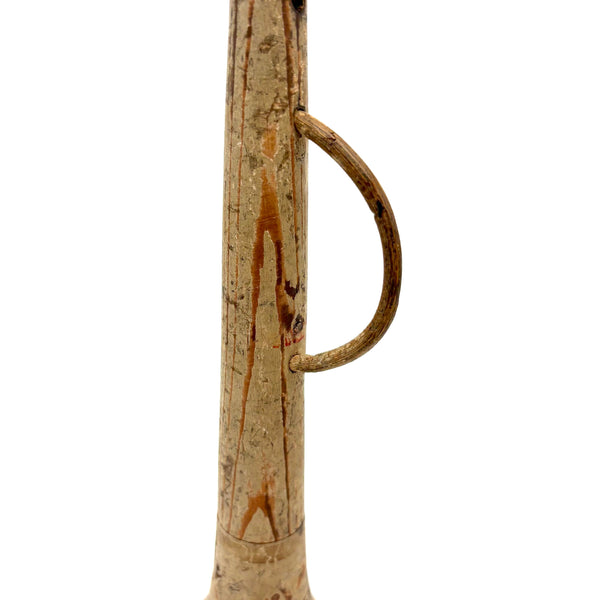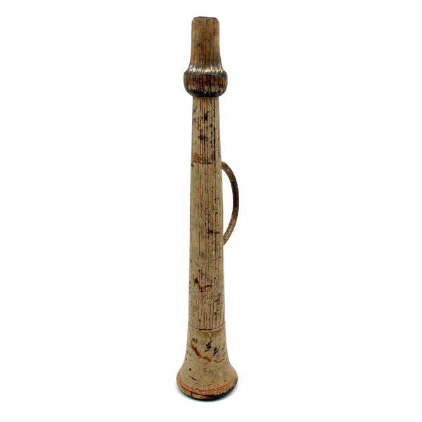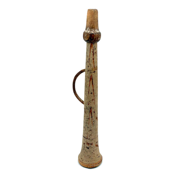 11 1/2" t. 1 7/8" d at opening, 2" across at handle. Good antique condition, sturdy and sound and blows just as it should. Some loss around the exterior lip of the horn end, as documented. Near that end the initials AP (I believe) are scratched into the paint. Stands up squarely on that end.