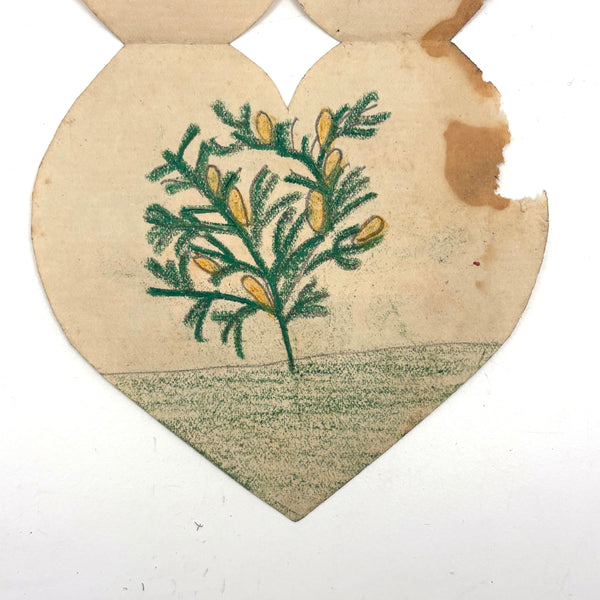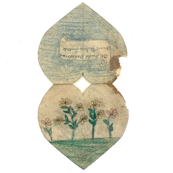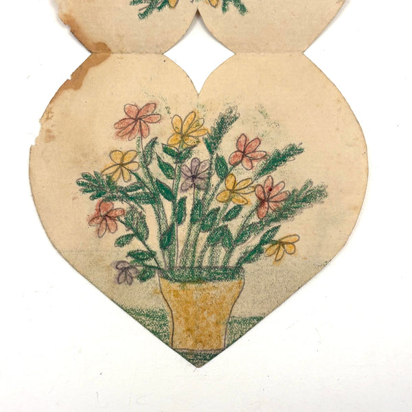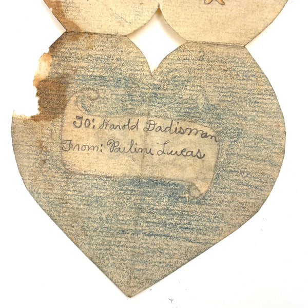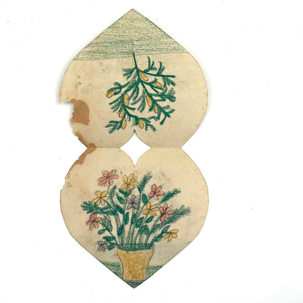 Anyway, I purchased this one from a great Pennsylvania dealer who shares my love for these sorts of things. I was sold on it without even opening it, so then a delight to discover this joyful pot of blooming flowers and what feels like a pear tree with pears growing upside down/skyward on the opposite side! A little loss and toning around the tear, but such a charmer still. From Pauline Lucas to Harold Dadisman, lucky boy. (I found a Pauline Lucas of Washington, PA born 1900 and a Dadisman family there too so think that is them, which would put this valentine c. 1910 or so; seems right.)