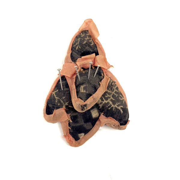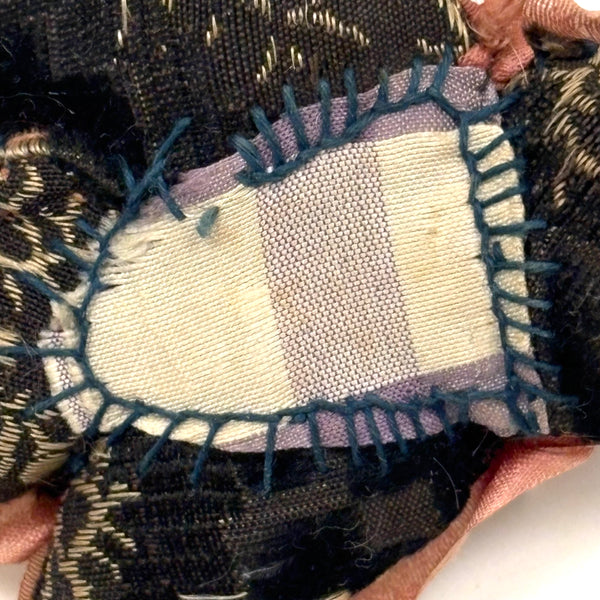 Just too sweet a little pin cushion to resist, which to me looks something like a bird or bee--flying into spring! Clearly made with a lot of love, with that pink silk ribbon hand-stitched all around the edges, a small gap left at the nose end for hanging. Terrific fabric too, brocade I want to call it, with cream on black seaweed pattern and areas of well worn velvet. And then a pretty little blue and white patch sewn on to the underside, I presume a slightly later mend. Charming.