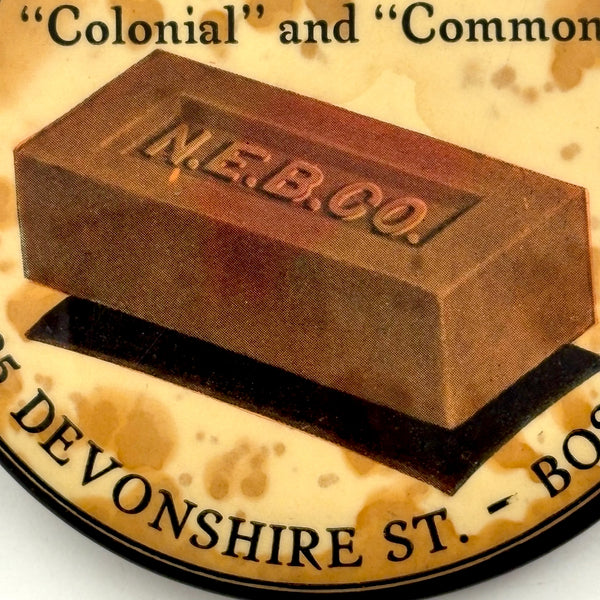 I found this one in Cambridge MA, just a few miles from Devonshire St. in Boston, where the New England Brick Co, founded in 1900 as a consolidation of numerous brick manufacturing plants across New England and New York, had its offices. At its height, the company controlled over 30 brickyards in the Northeast, with NEBCO's "Harvard Bricks," advertised on this mirror, extensively used in the 1910s-1920s construction of Georgian Revival buildings around Harvard University. An interesting piece of history, and spending any time in Boston and Cambridge, one will see bricks that look just like this one all over the place. The mirror is an uncommonly large and heavy for an advertising mirror--which seems apt! It was produced by Parisian Novelty Co, Chicago, established 1898, best known for its advertising mirrors of just this sort. I've done a good bit of searching and can find no other example of this out there but for one reference image of it on a website devoted to brick history!