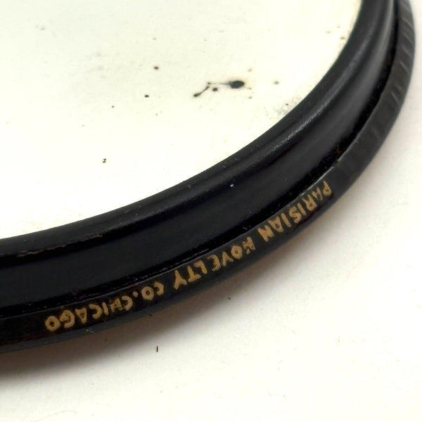3 1/2" d. Toning spots all over as evident but even so it reads very bright and crisp, with essentially no wear to the celluloid, clean edges and the mirror in very good shape, just a few tiny scattered spots, as there should be.