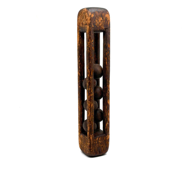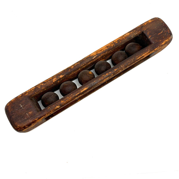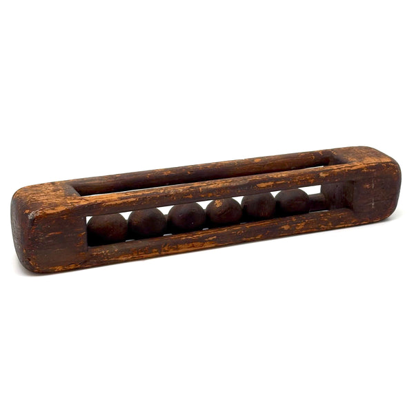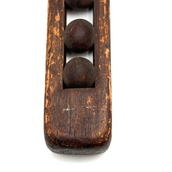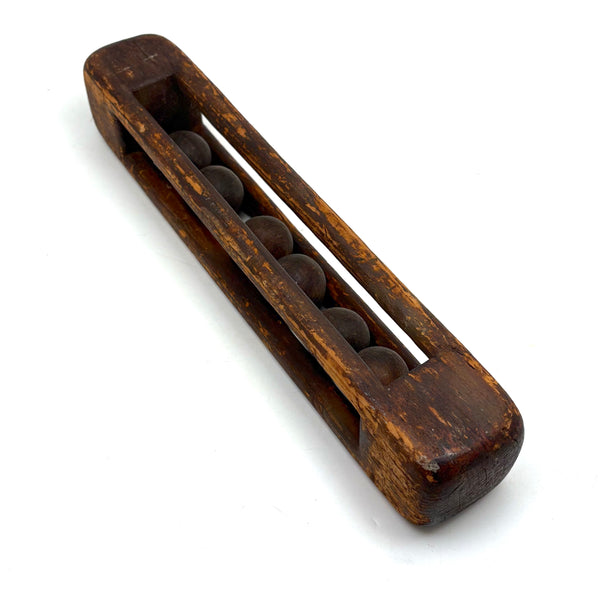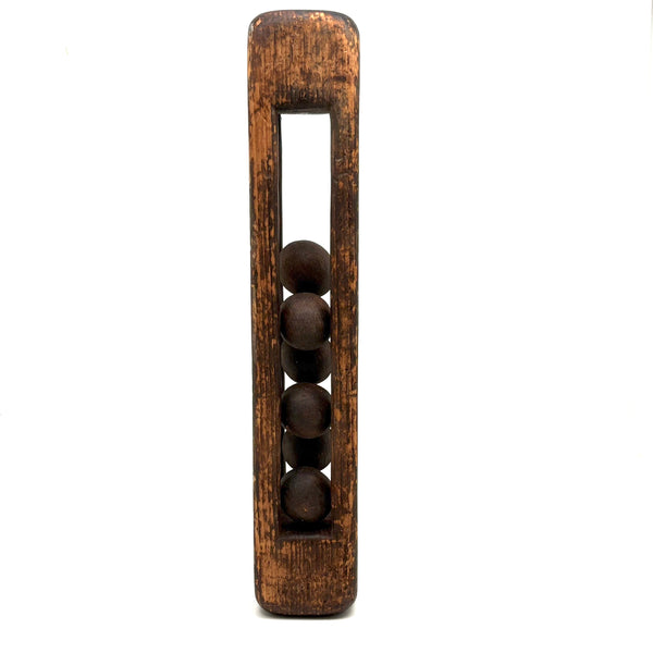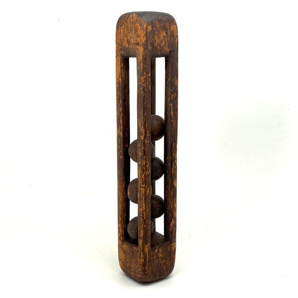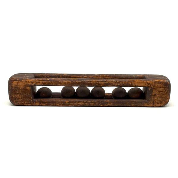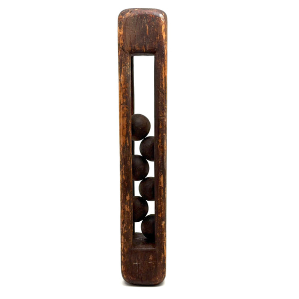 Hard to tell the scale here but this is a large one--a foot long--and an old one, 19th century I believe, with remnants of original dry red paint. The six balls inside are fairly small for the "cage" meaning that they naturally land in a staggered way, as show in first several photos, which I really love. Terrific old patina, substantial presence, nice both stood on end and laid horizontal.