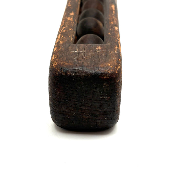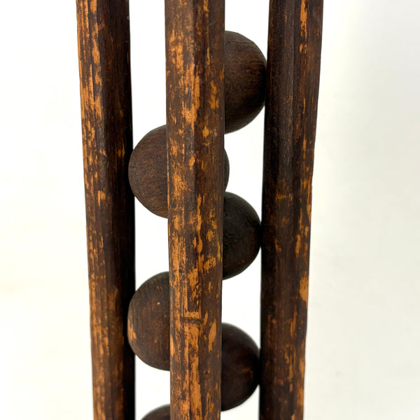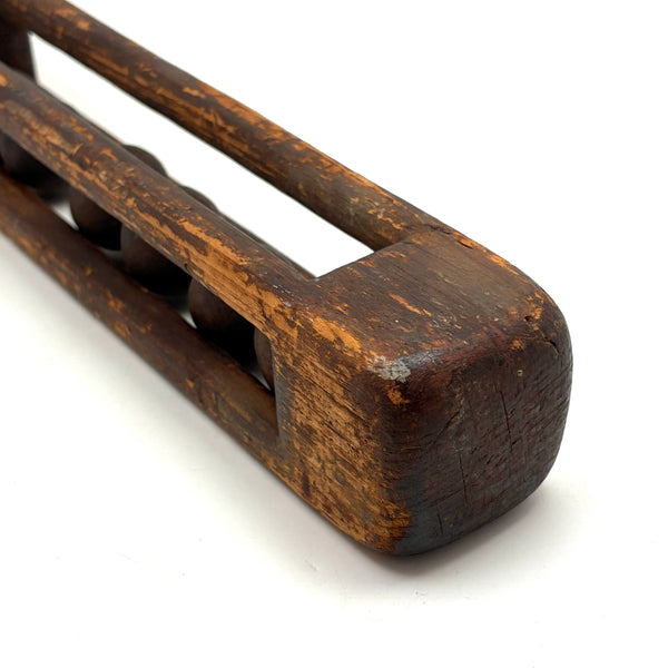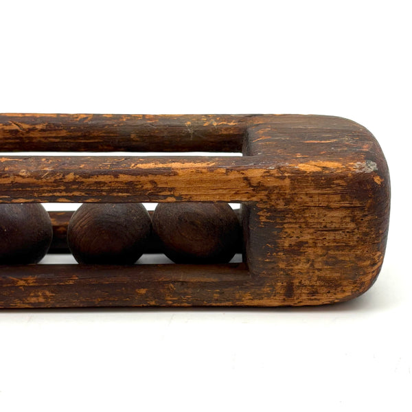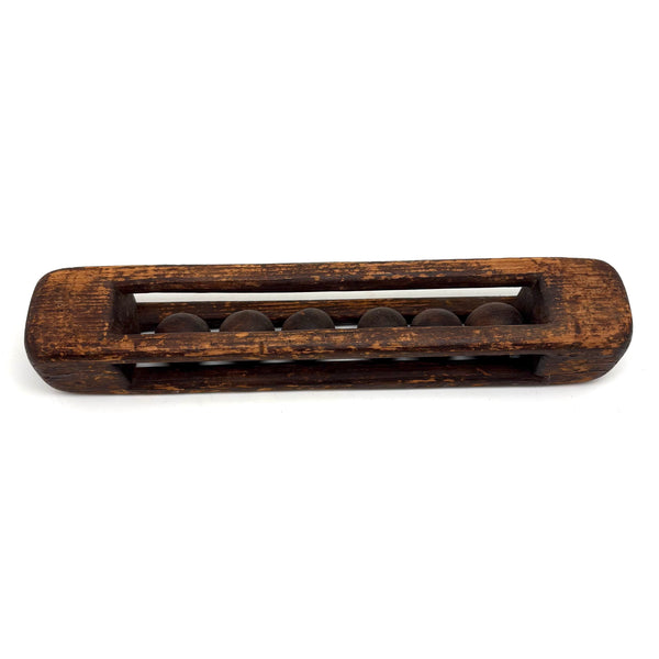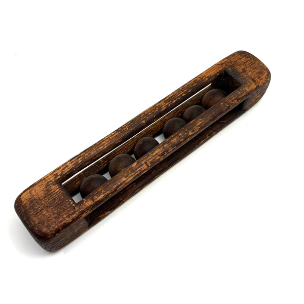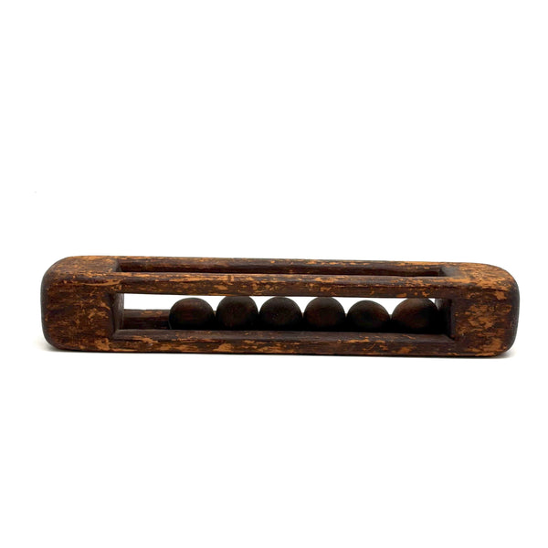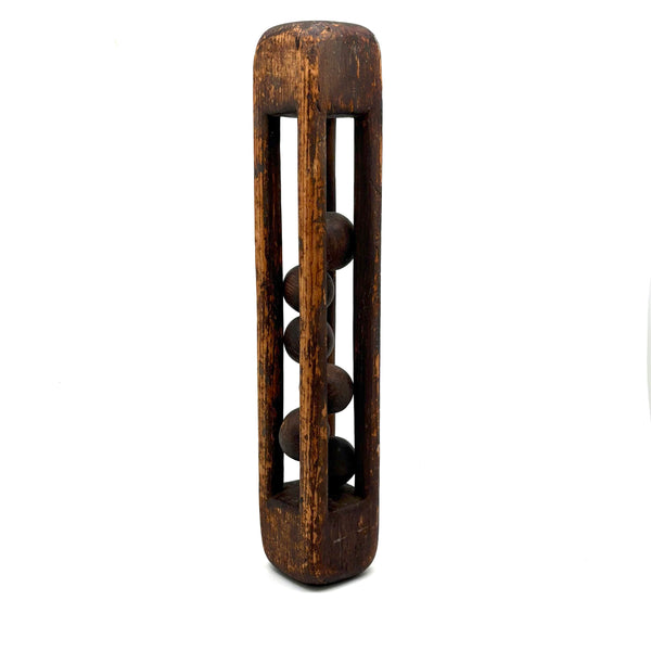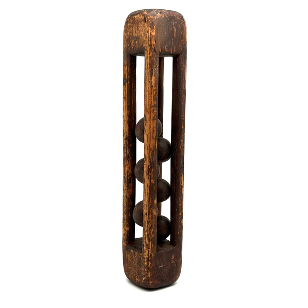 Hard to tell the scale here but this is a large one--a foot long--and an old one, 19th century I believe, with remnants of original dry red paint. The six balls inside are fairly small for the "cage" meaning that they naturally land in a staggered way, as show in first several photos, which I really love. Terrific old patina, substantial presence, nice both stood on end and laid horizontal.