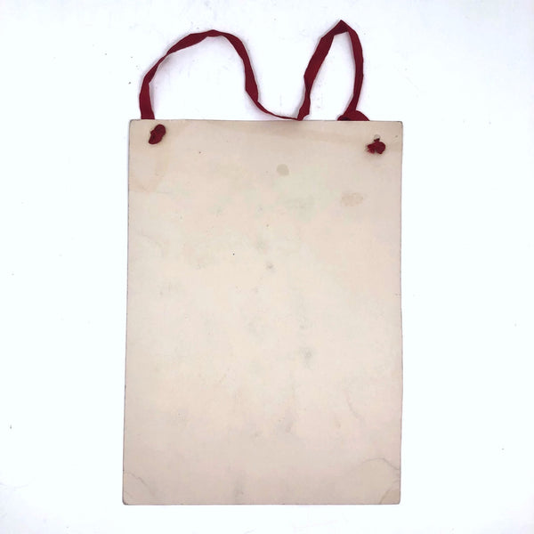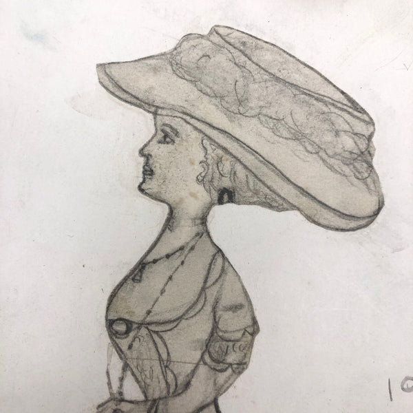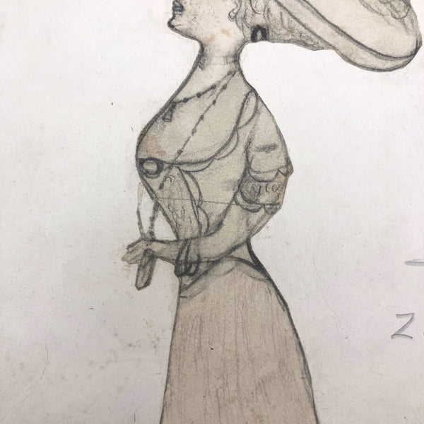 It's the massive scale of this woman's hat that really makes this drawing for me (which, in absence of legs to sturdy her would most definitely cause her to topple!), though I love the detailing her jewelry and the flourishes on her dress too. The drawing was done on an semi-translucent onion skin type paper in graphite, then carefully cut out and pasted onto card, with a red ribbon threaded through two holes at top that I believe likely bound it with some others. Signed ZD and dated 1910.