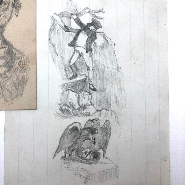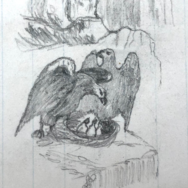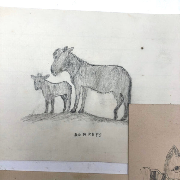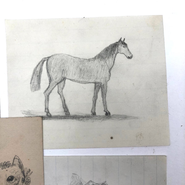 As you surely know by now, nothing delights me more than old drawings, the more naive the better. These are from a larger group of 19th c. graphite drawings I found yesterday at a show in New Hampshire, which I've divided into sets--so many fabulous little animals--and here one person too! I really love the face on the cat holding her fan, and the proud stoicism of the horse, and especially this pair of eagles protecting their eaglets in the nest!