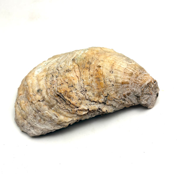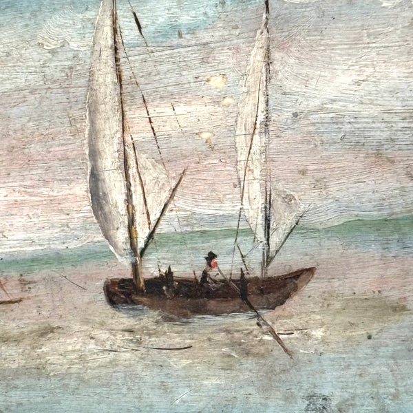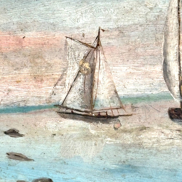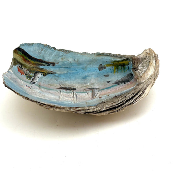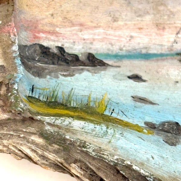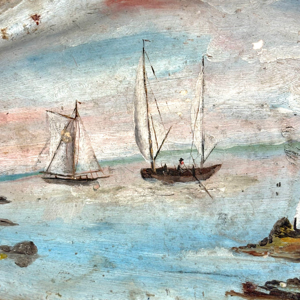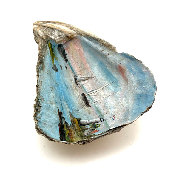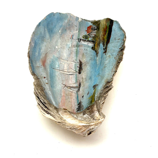 The manner and relative fineness of this folk art (likely sailor made) shell painting says 19th century for sure. I've always got an eye for a good folk art painting on a shell, but this excellent seascape, purchased from a dealer in Maine, was an especially happy find, all the more so for having been painted on an oyster shell--and an extra large one. With a Dutch flag flying from the lighthouse, so one presumes painted while at sea, far from home. Probably a small loss along the far right edge, but if so it doesn't seem we've lost much. Lovely, painterly, and very atmospheric.