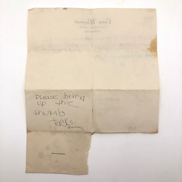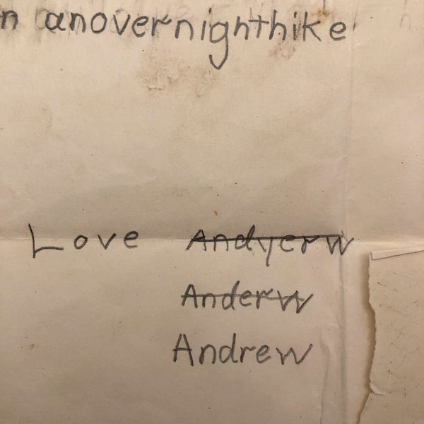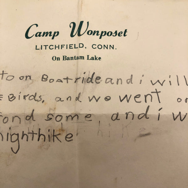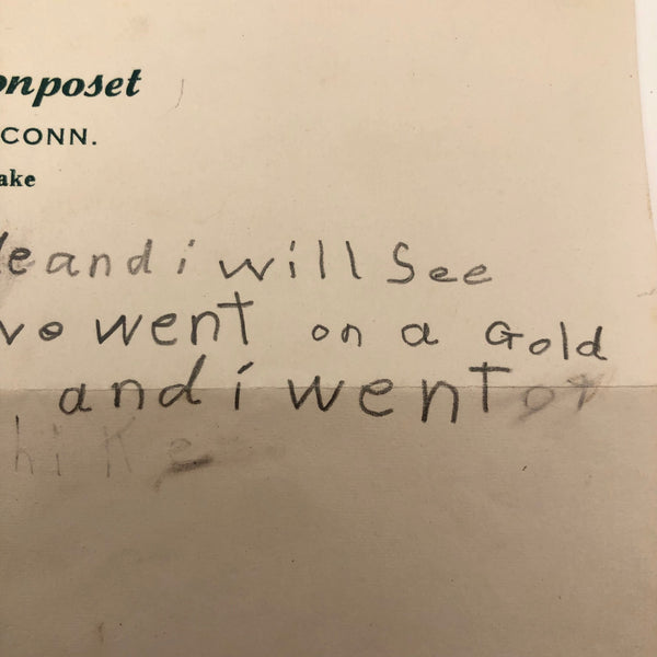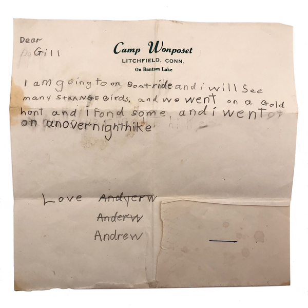 Exciting times for Andrew at Camp Wonposet! Boat rides and strange birds and an overnight hike, and he struck gold too! Best of all though are the three attempts at spelling Andrew — perhaps by a camp counselor trying to help but themselves not very good at spelling!!? On reverse, a note in a different hand to please bring up the thumbtacks.