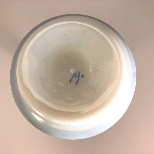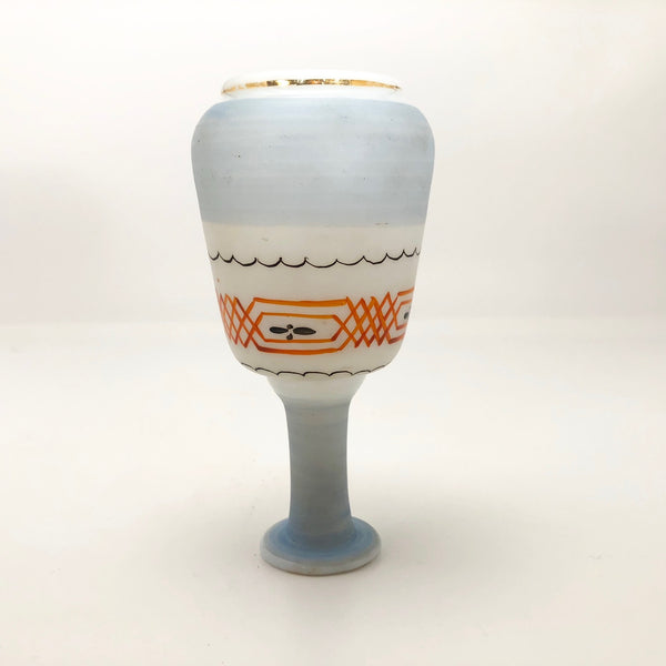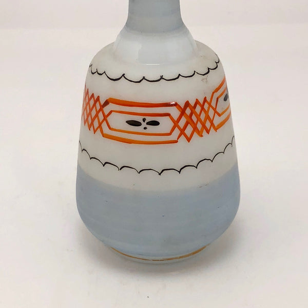 I don't think it gets much sweeter than this delicate hand-blown, hand-painted glass bud vase with orange and black decoration. With Art Deco style and a gold painted band around the bottom, my guess is that is Bohemian and dates to the 1920s or 30s. The middle area of the vase appears frosted white, while the neck and lower half are painted a very pale blue. The orange geometric design and black scalloped lines are slightly more thickly painted.