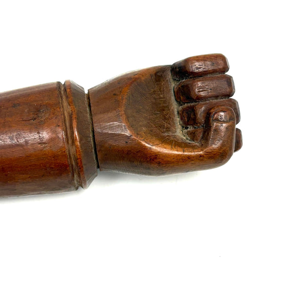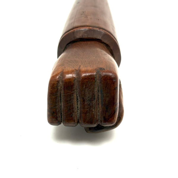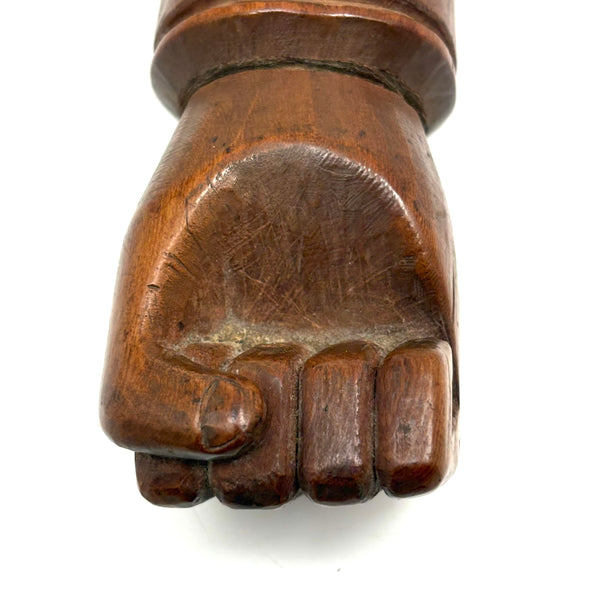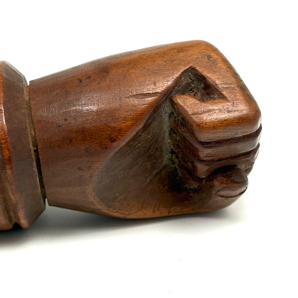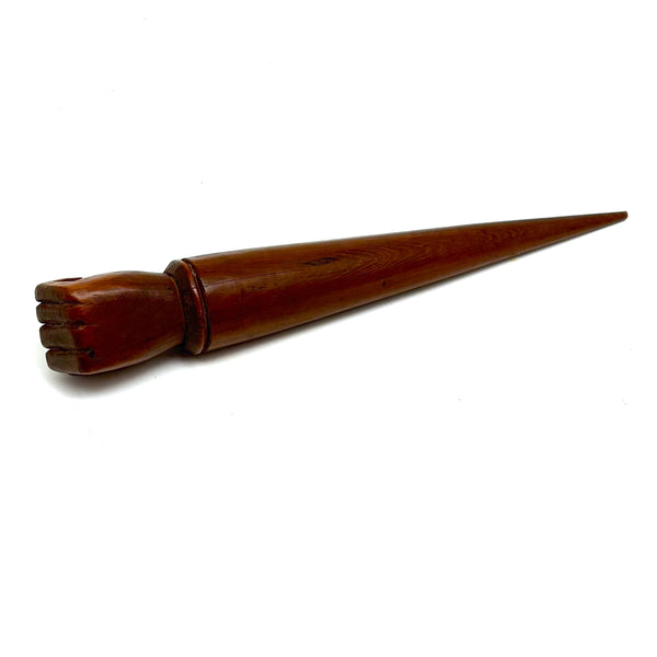 This is a wonderful antique folk art sailor's fid carved of hardwood. I purchased it from a dealer specializing in antique nautical items, who I believed had just brought it in, and as I carried it to the front of the (excellent) antique co-op where I found it, one person after the next enthusiastically admired it. Fids, or marlinspikes, vary in size but are always conical and tapering in form; they were essential tools used by sailors for a variety of purposes, particularly ropework: holding open knots, untangling rigging, separating strands of rope for splicing, making grommets in canvas, etc. etc. They were usually made from wood, most commonly lignum vitae but other woods as well, and also whalebone. I've seen ivory examples with carved fists like this, but am not sure I've ever seen one of this scale carved of wood with a hand, and it's a beauty. Mid-late 19th century or so I would guess, in beautiful condition.