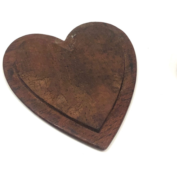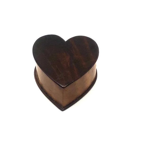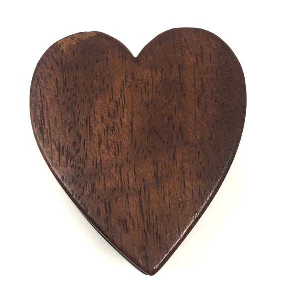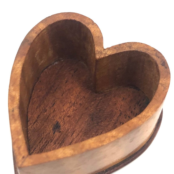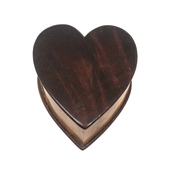 A lovely little treen heart shaped box made of three different woods, with a very tight fitting lid lid with carved underside that sits flush and holds tight. No nails, so I presume the base (walnut I believe) was glued on, though done very carefully. I'd guess early 20th century or so. Perfect now for holding--or delivering!--a rings or other precious little things.