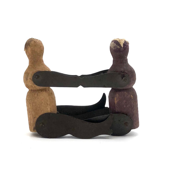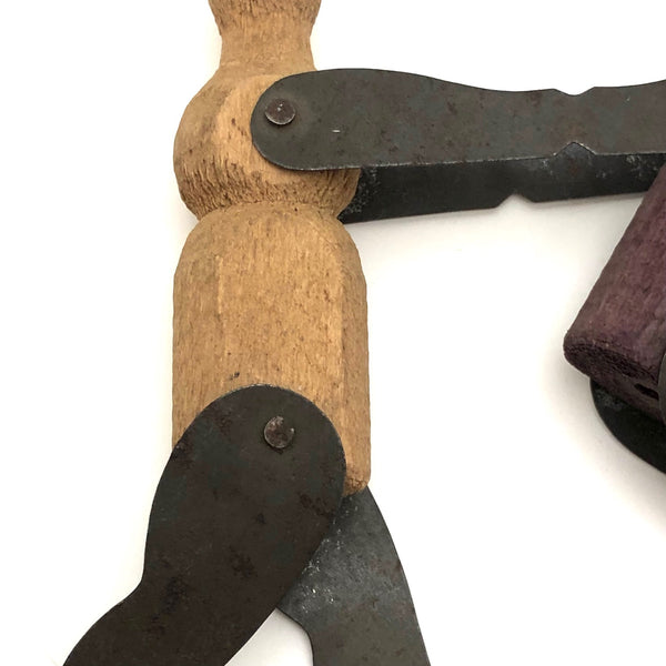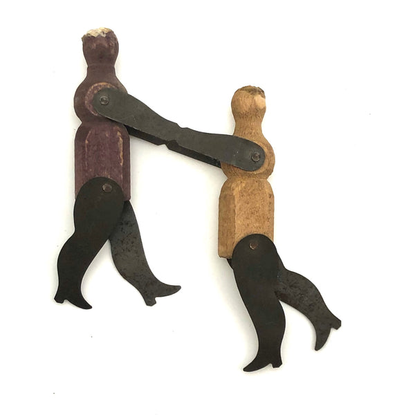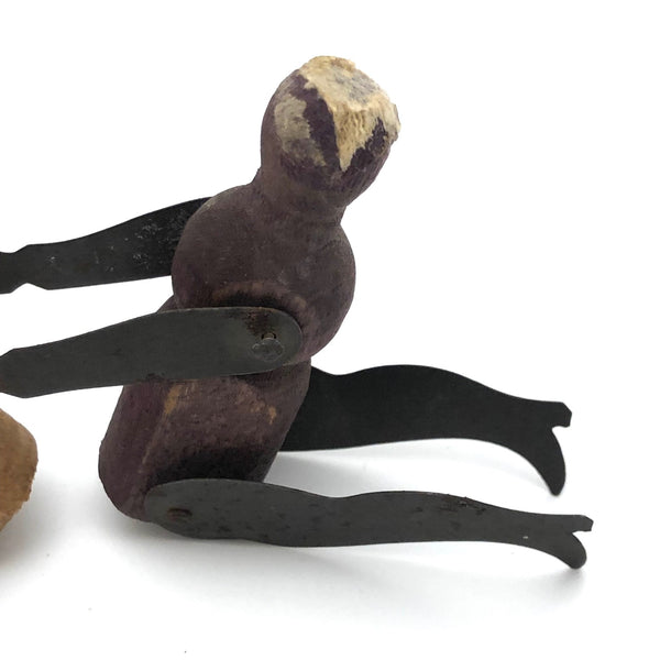 A super sweet pair I think, fashioned from a couple of clothespins I believe, one stained a dark plum color, and the two forever joined by their cut tin arms. I especially love the heeled boot silhouettes of their dancing legs, and the fact that they can be balanced to sit up on their own. It seems they might once have worn hats at there is some white paint on the head of the plum one, and some roughness on the top of the other, and both have small holes in their bases, suggesting perhaps they once sat on think dowels.