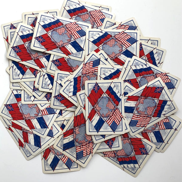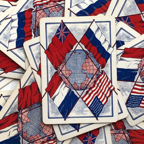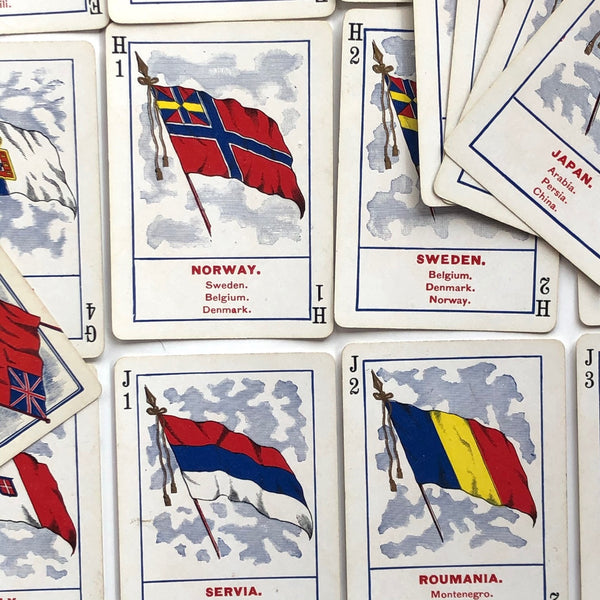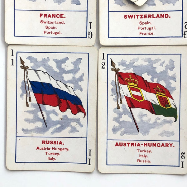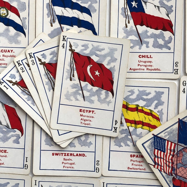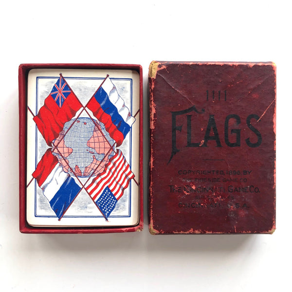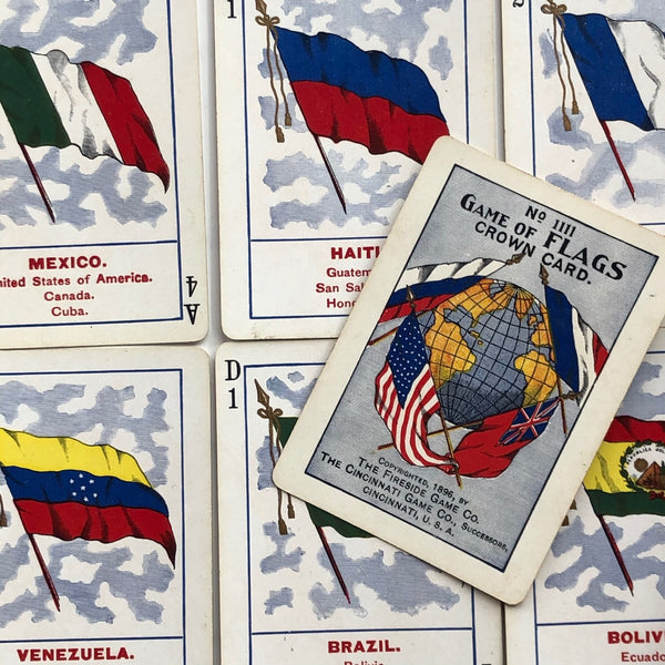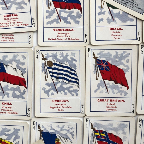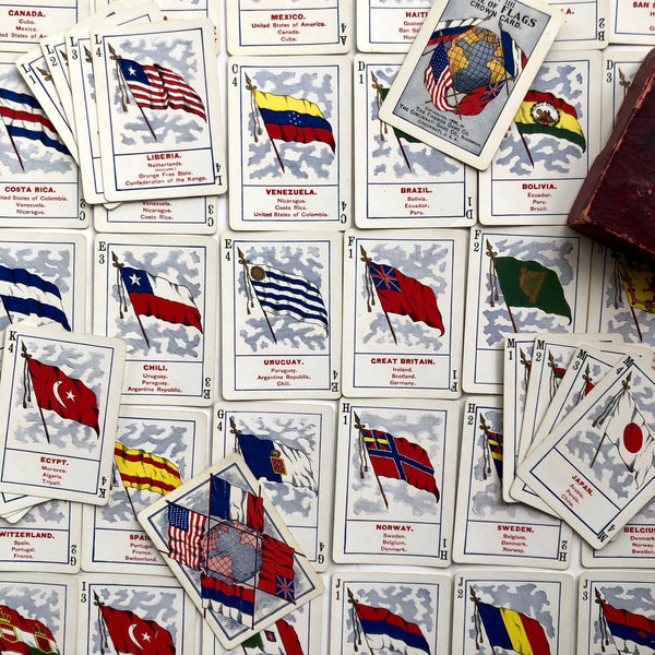 I understand that these cards were originally patented by the Fireside Game Co. in 1896 to commemorate the first modern Olympic Games held that year. In 1900, Fireside changed its name to The Cincinnati Game Co, which appears on this deck, which I believe date to around that year. I really love the look of them, and certainly they provide a history lesson relative to the appearance of world flags at the end of the 19th century and colonies held at that time, and also a geography lesson for young (and maybe some old!) players too as they are in large part grouped by proximity. The rules are pretty much like rummy, as one tries to lay down sets of the same letter.