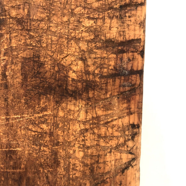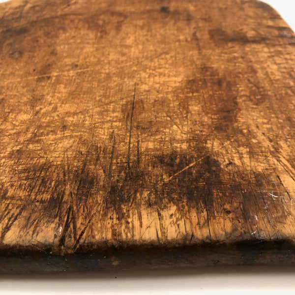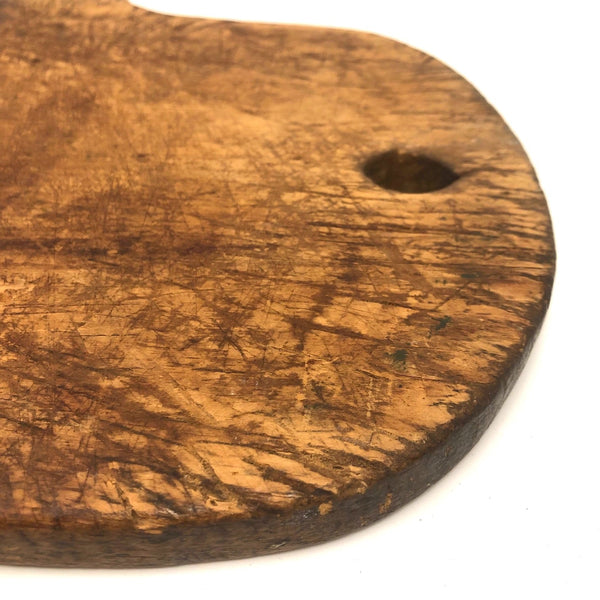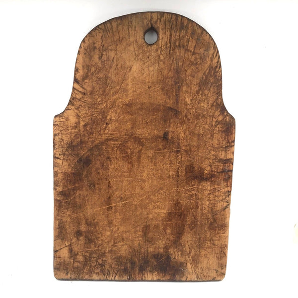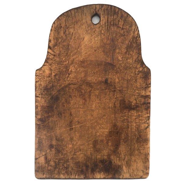 It's pretty much impossible to convey presence through photos, but trust me on this one--hang it in the kitchen and/or use it for serving bread and cheese, and it will make you feel very glad. 19th century, with a wonderfully imperfect tombstone top and hole for hanging, and old knife marks all over adding up to a wonderfully warm thing that feels as much as embodiment of home and hearth as one could imagine.