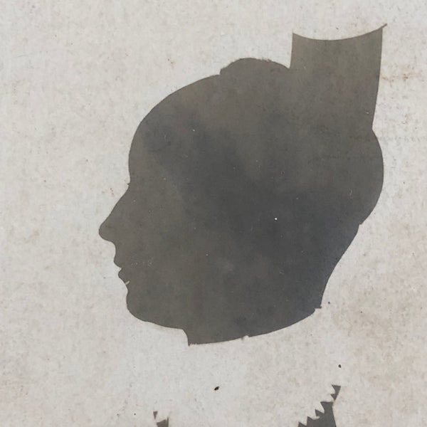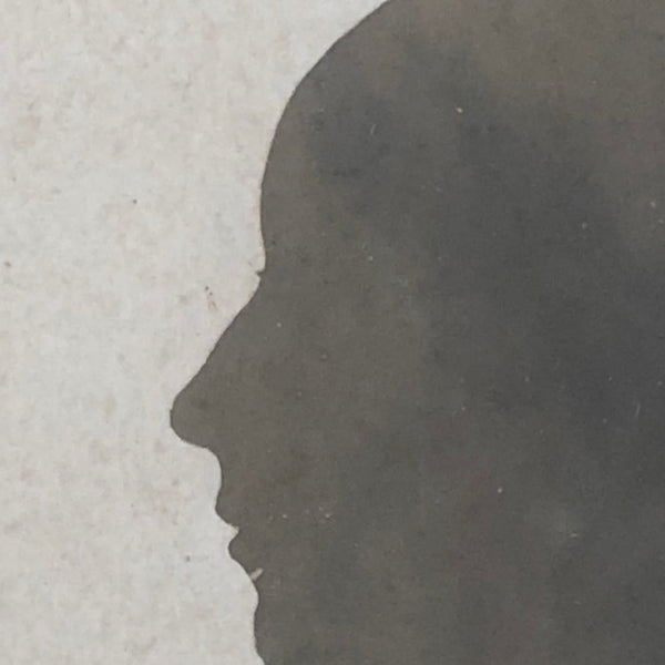 I believe this is an antique photo of an early cut paper silhouette, I'm guessing the original silhouette c. 1840s, and the photo late 19th c. I love photographs of portraits rendered in other (earlier) media, translating likenesses from one media/genre to another and carrying them forward. With lovely scalloped edge to the lace collar, and eyelashes visible. The color is a silvery gray, which, along with the negative of the collar, makes it feel al the more like a shadow.