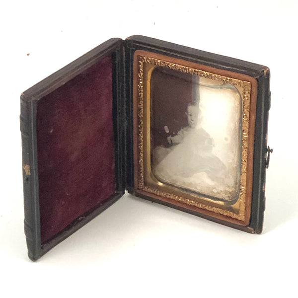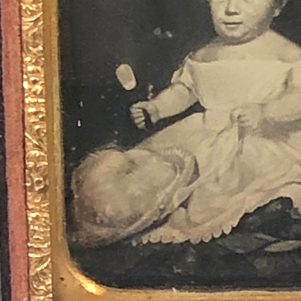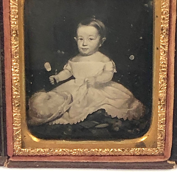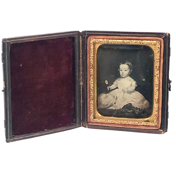 I've done a bit of studying of Field's paintings and this certainly seems possible, but I don't know for certain. Certainly a wonderful daguerreotype in any event, with charmingly self-satisfied expression on this child's face as she (I presume) holds mirror up in one hand and the ribbon of the feathered hat in her lap in the other, with a handful of toys laid at her feed. Certainly seems a portrait of a luxurious life to me, and perfectly set off by the dark background, which makes it seem almost as if she were floating.