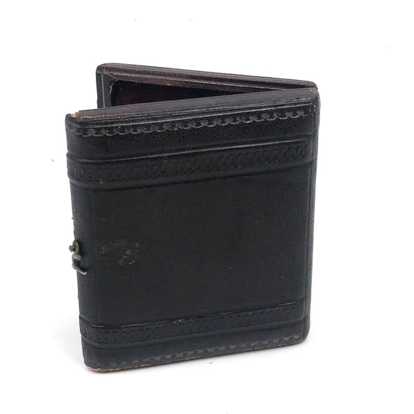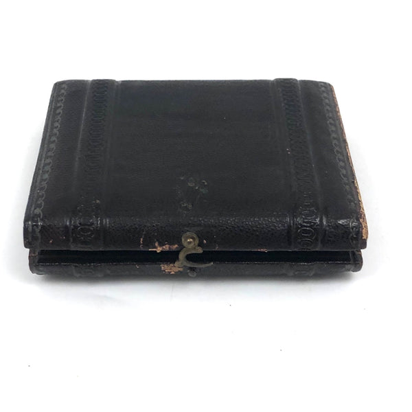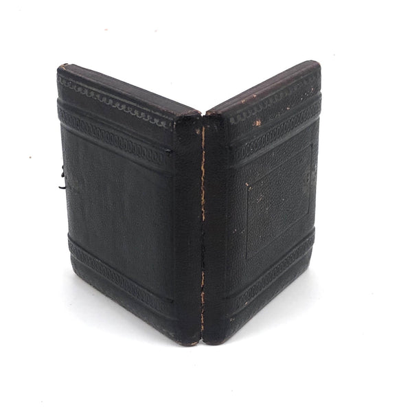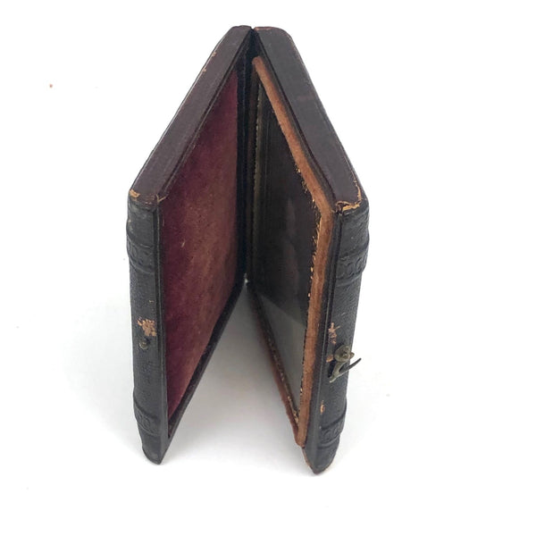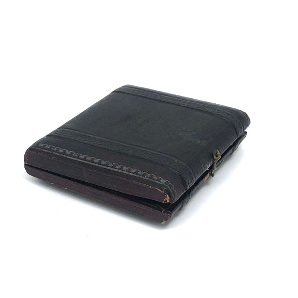 Closed case measures 2 15/16" x 2 9/16". Good antique condition with general surface wear to leatherette case, which does not quite close all the way, but still has original hardware. The image, crisp and clear, shows some spotting and a little discoloration primarily along the top edge, as documented.