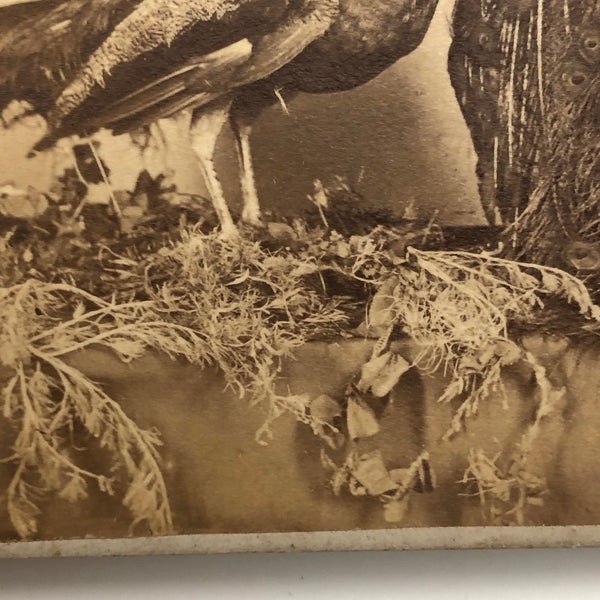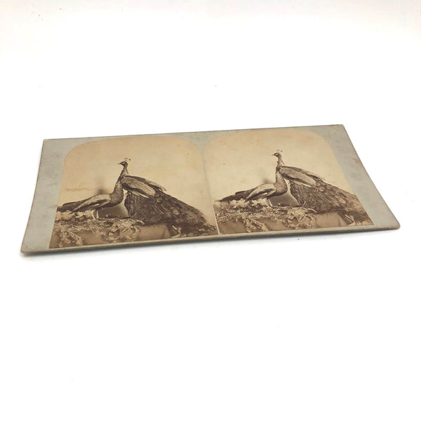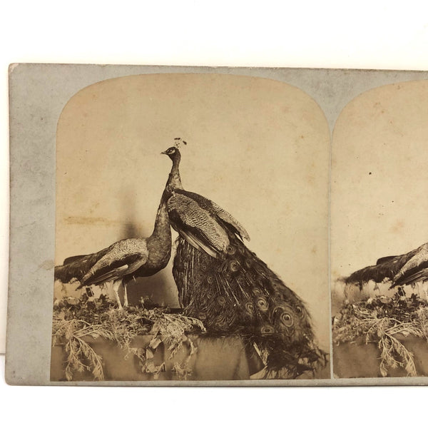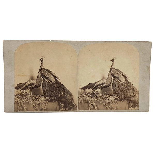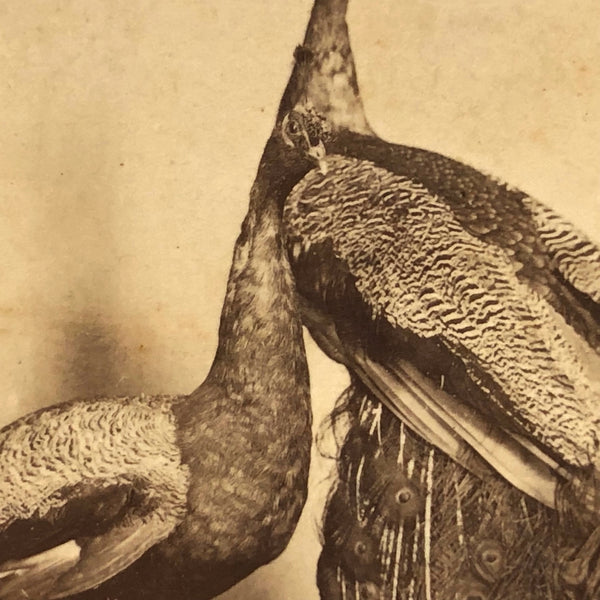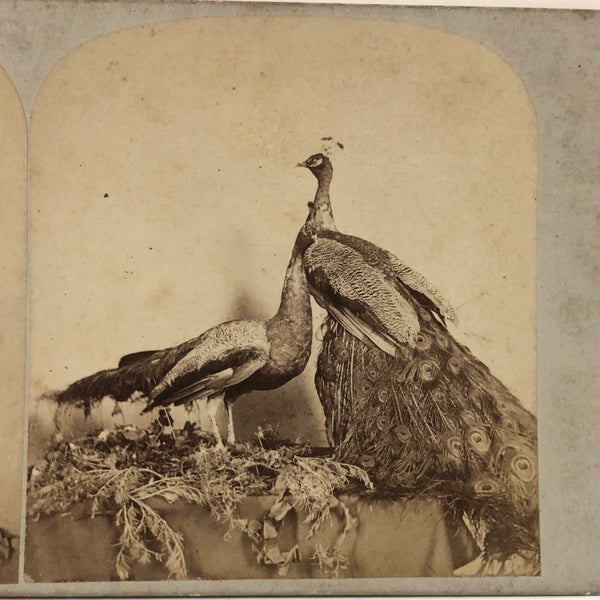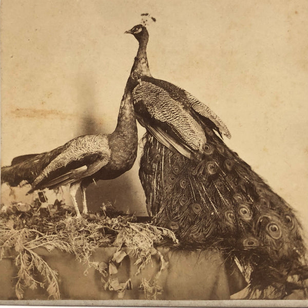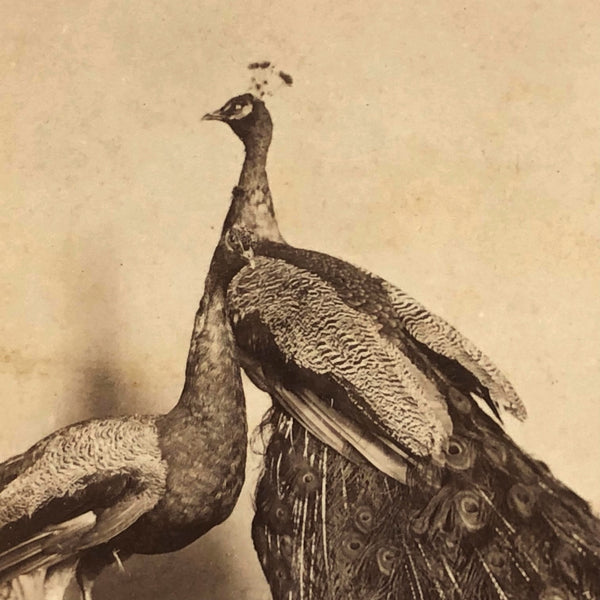 I though this 19th c. albumen photo stereoview featuring a peacock and peahen might make a pretty nice valentine, with the pair facing opposite directions but with heads precisely aligned. I like how the staggered stereoview cropping of the images gives each bird its due, too, with the tail feathers of the peacock fully in the frame of the left image, while at right it's the tip of the tail of the hen. And i love how the pile of dried flowers and leaves they stand atop seems all part of the dramatic plummage.