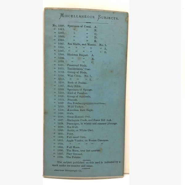 6 7/8" x 3 3/8" and in very good condition. Produced by the American Stereoscopic Co. with a list of the rest in the series on reverse. Late 19th c. I believe.