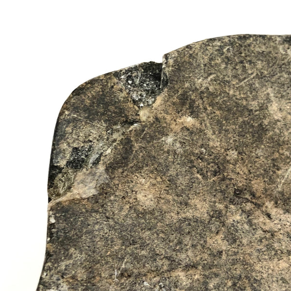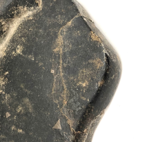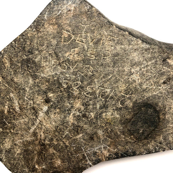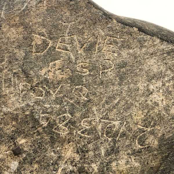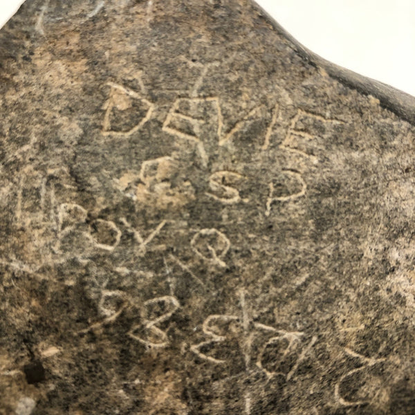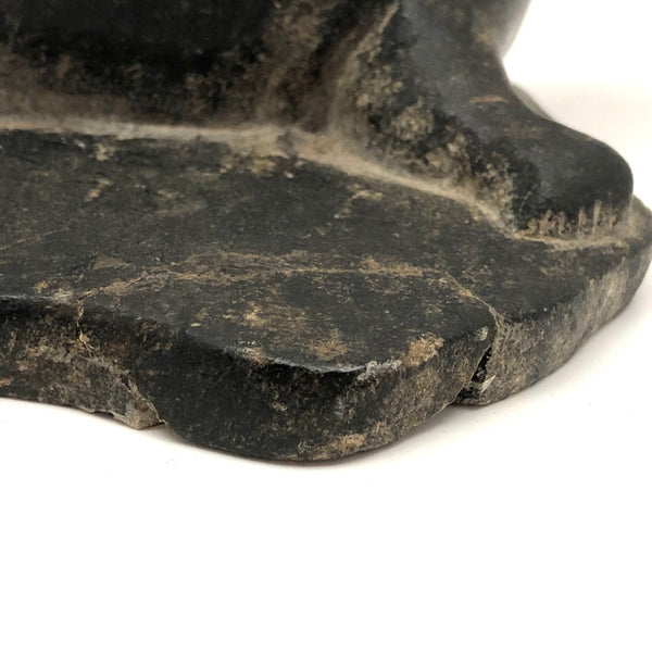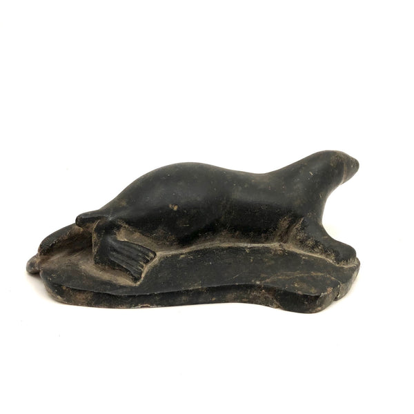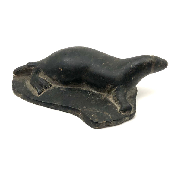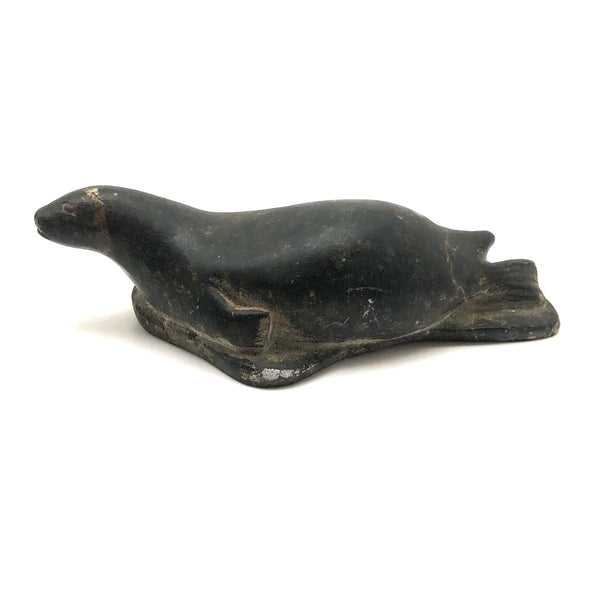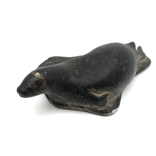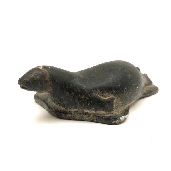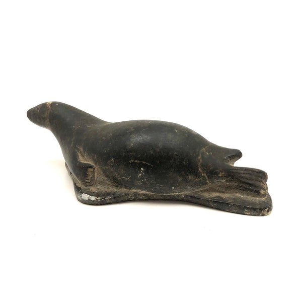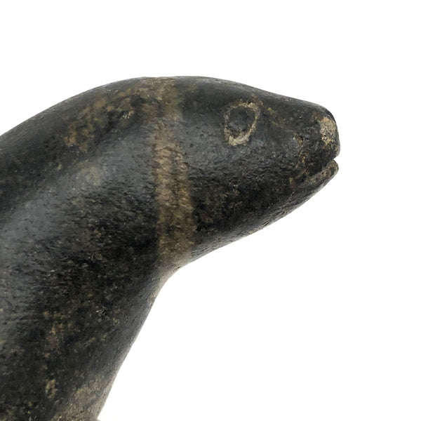 Signed "Devie," I believe this may be an early piece by Davie Atchealak (1947-2006) Iqaluit (Nunavut), also known as Devie. With quite a rich patina, I am quite certain it is an older piece, 1960s is my gut, and quite a beautiful one I think, with a light colored vein in the black stone creating a perfect ring around the neck of this graceful seal, stretched out on slab of stone, seemingly forever on the verge of slipping out to sea. Lovely all the way around, and I especially love the push-pull between neck stretched in one direction and front paw extended in the other.