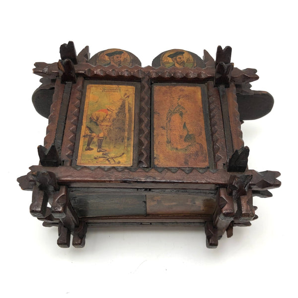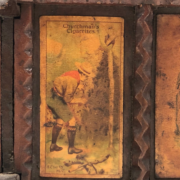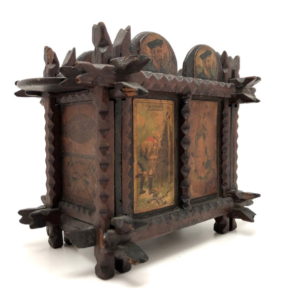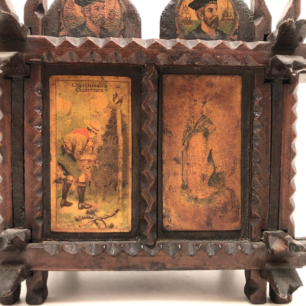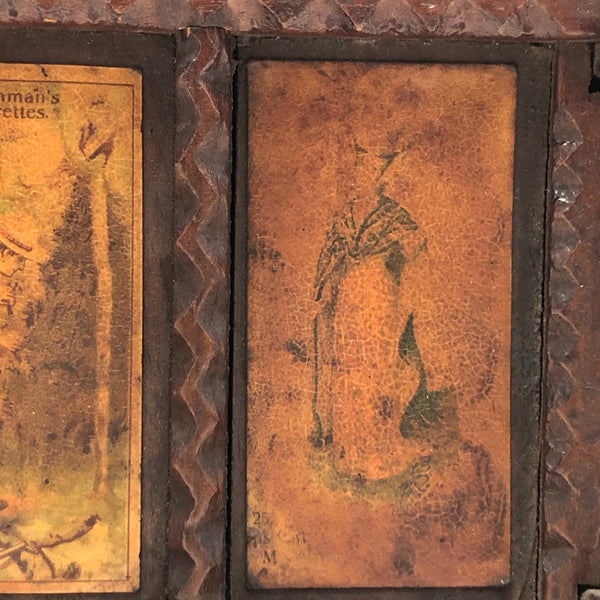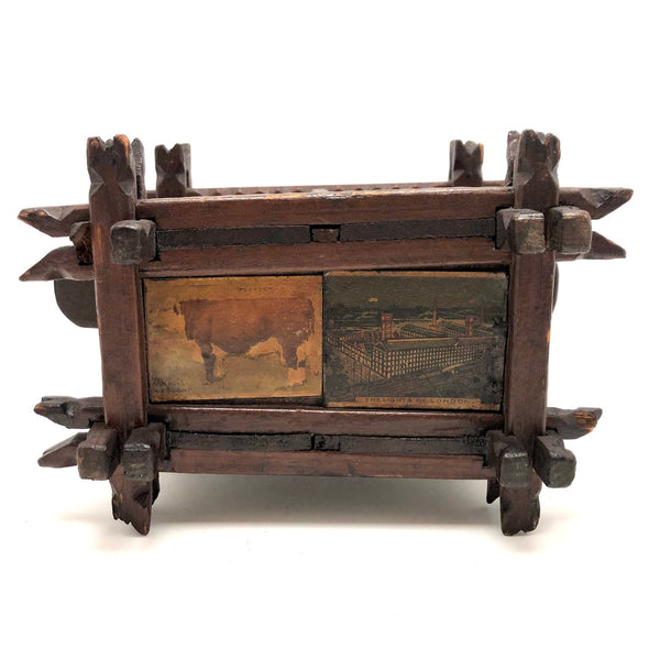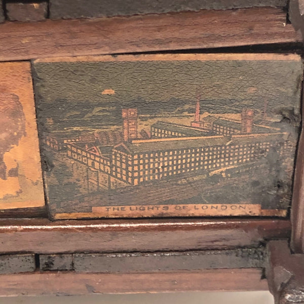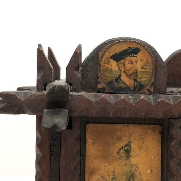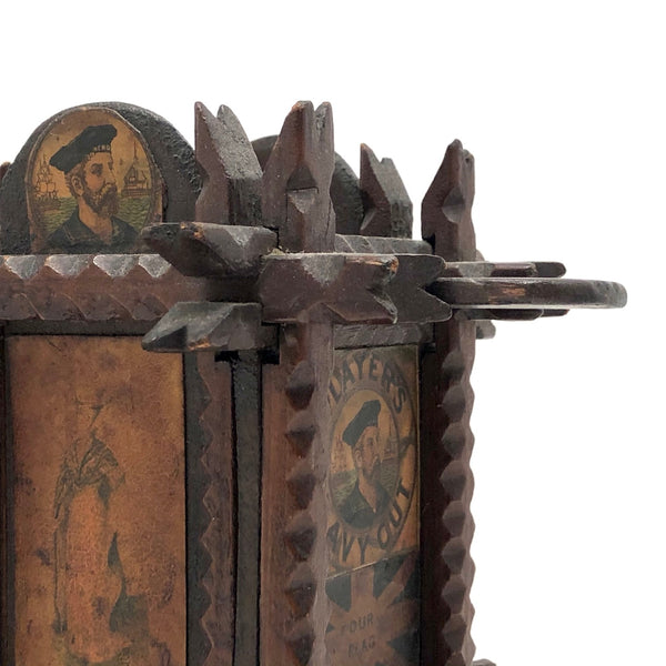 Every surface and detail of this wonderful antique British tramp art coin bank box is was carefully attended to, making it feel super special and full of surprises. Each panel features collaged images cut from cigarette labels, from the heads of Player's cigarette sailors, to a Churchman's cigarette Box Scout in action, to a bull and image of the "Lights of London" on the underside. The top of the box is a tapering, sliding lid with the a slit for coins at the center--easily removed to empty the bank. And beautiful chip carving on the interlocking crown of thorns type structural framework, which is still holding together very sturdily. Really a beauty!!!