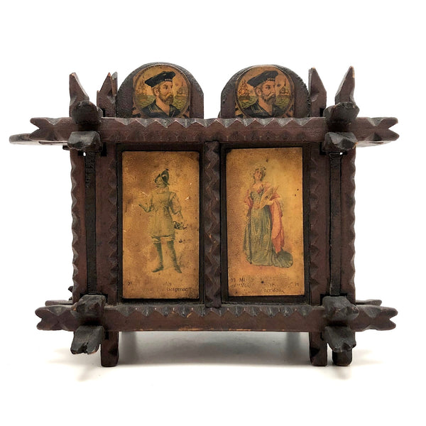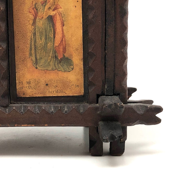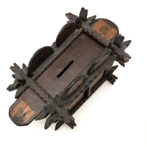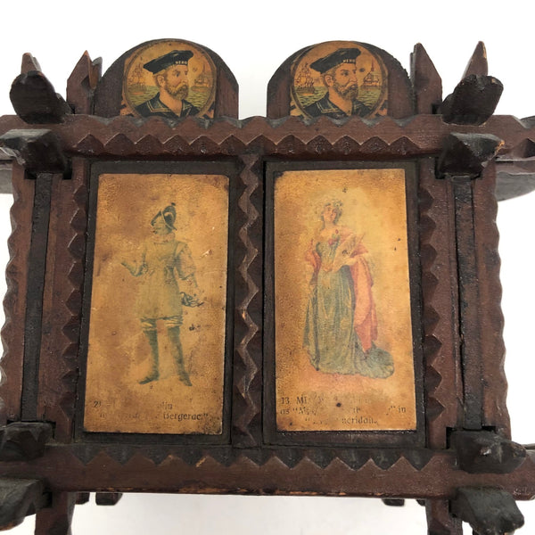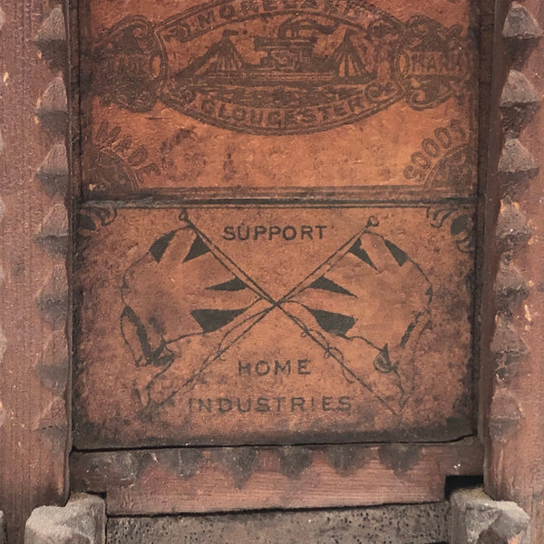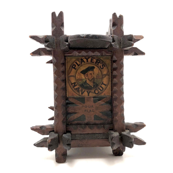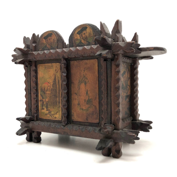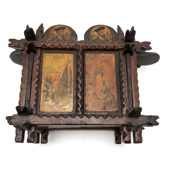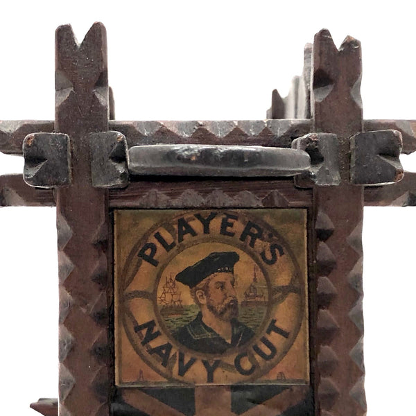Every surface and detail of this wonderful antique British tramp art coin bank box is was carefully attended to, making it feel super special and full of surprises. Each panel features collaged images cut from cigarette labels, from the heads of Player's cigarette sailors, to a Churchman's cigarette Box Scout in action, to a bull and image of the "Lights of London" on the underside. The top of the box is a tapering, sliding lid with the a slit for coins at the center--easily removed to empty the bank. And beautiful chip carving on the interlocking crown of thorns type structural framework, which is still holding together very sturdily. Really a beauty!!!