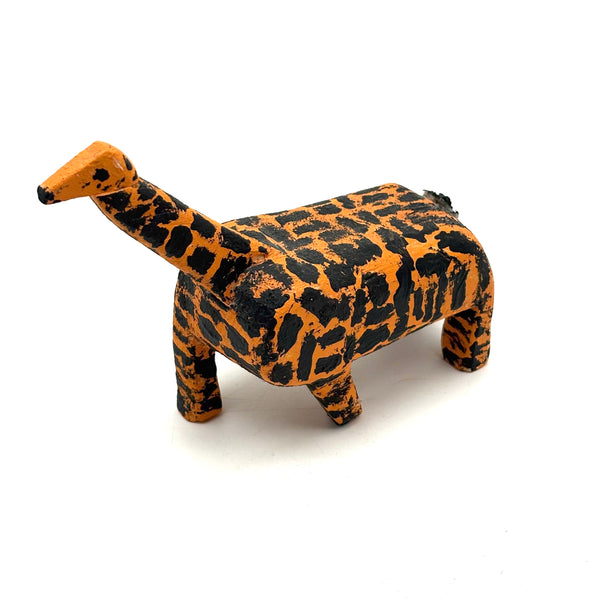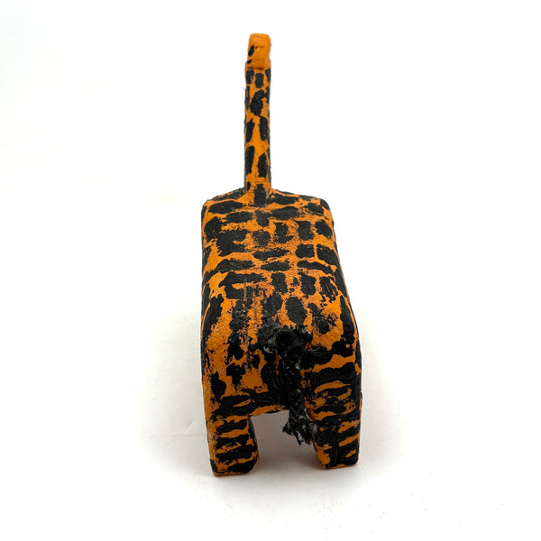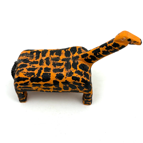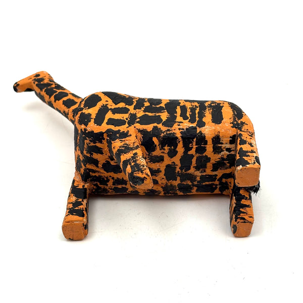 The best giraffe. Bright orange with marvelously painterly, very black spots covering every inch. Moving slowly forward. Wooden body with a black painted rope tail. C. 1970s or so I might guess. Love.