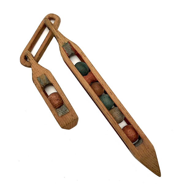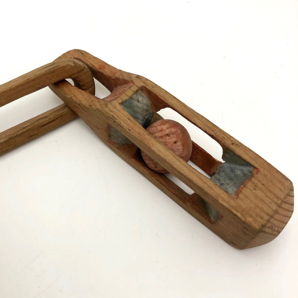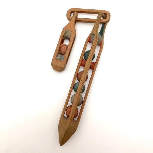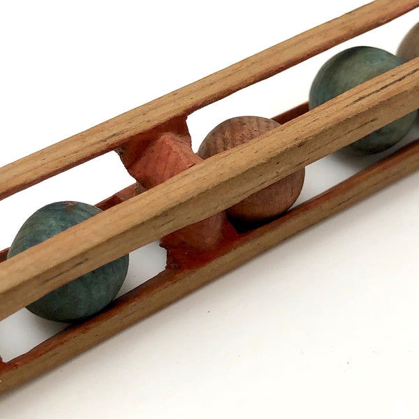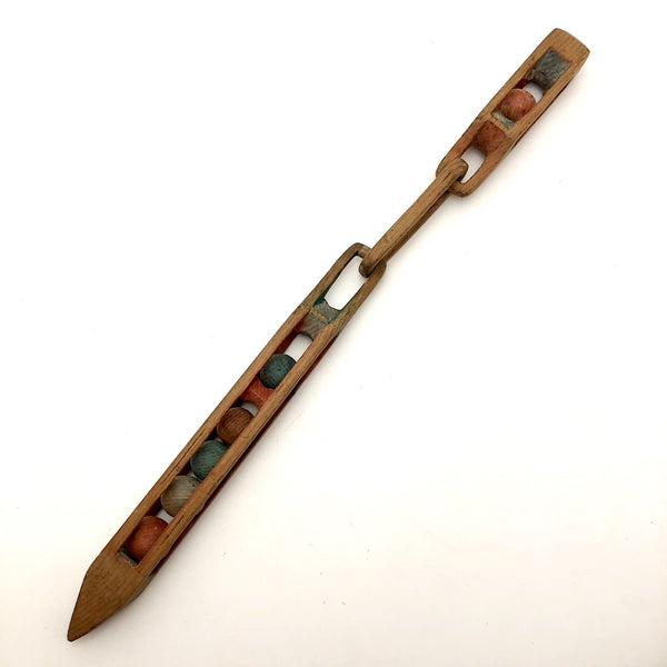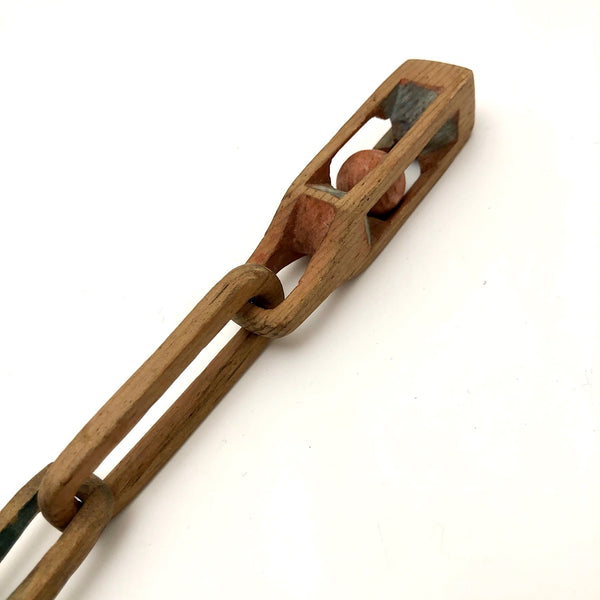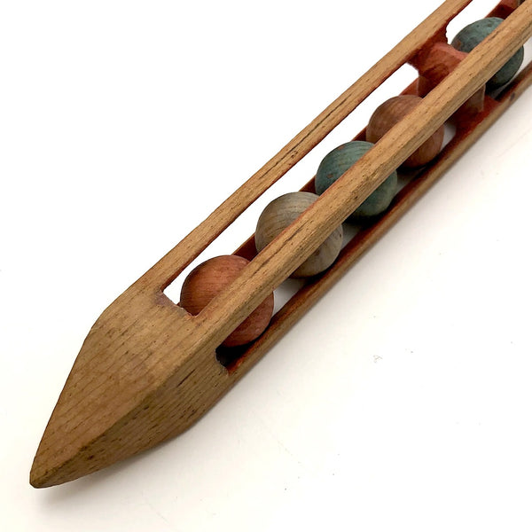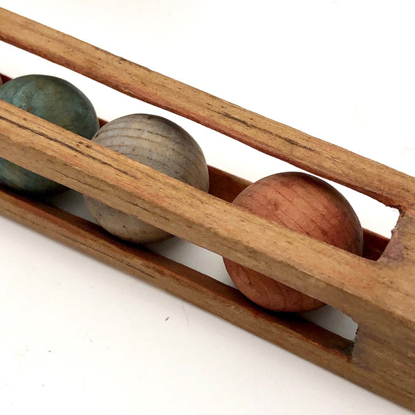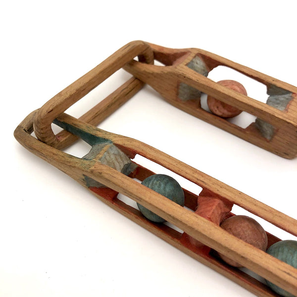 I'd never seen a painted or colorfully stained wooden whimsy before this one, and a little searching confirms they're pretty rare (And the colorful little carved balls inside of this one remind me of one of my other favorite things, clay marbles!) I believe this one likely dates to the early 20th century, and I believe is pine. All carved from one piece of wood, and it certainly must have taken some effort to get to paint those balls inside their cages, too. Really a pretty special one I think, and great addition to a whimsy collection.