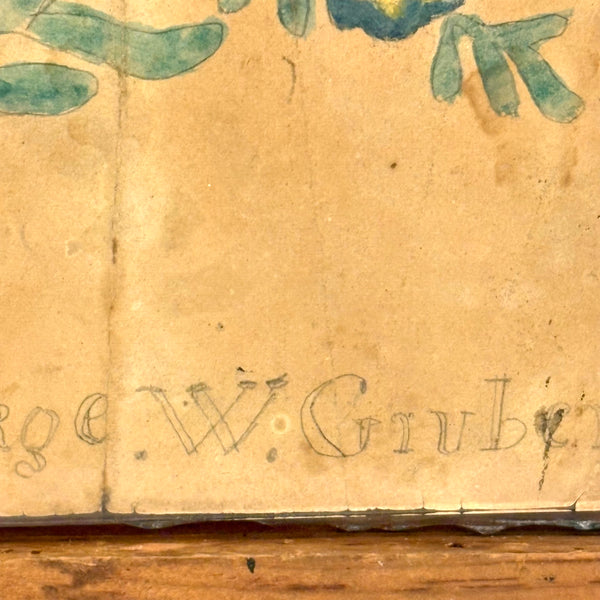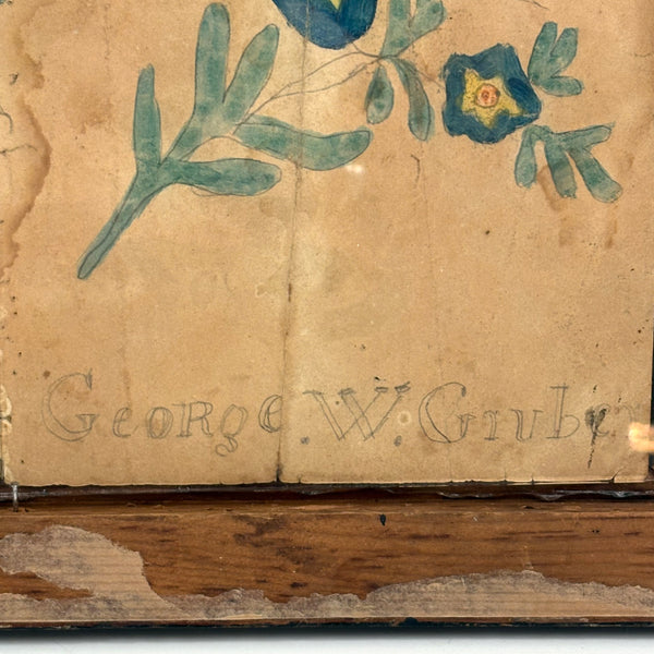 It's quite a lucky week when I've found two fraktur watercolors--and this one double sided to boot! And I think both sides are equally good, both with birds and flowers--happily floating between two panes of glass in the frame, so that one can enjoy them both. With the reverse side signed proudly by a George W. Gruber (I believe it is Gruber)--I have found numerous Gruber's from Pennsylvania, where this was surely done, including a George W. who died in 1876 at the age of 21--which seems about right in terms of the age of this watercolor, though I don't know that's this George for certain. Watercolors like this are what live in my dreams, so rich in color and so full of life. I will be very glad to keep this one for myself.