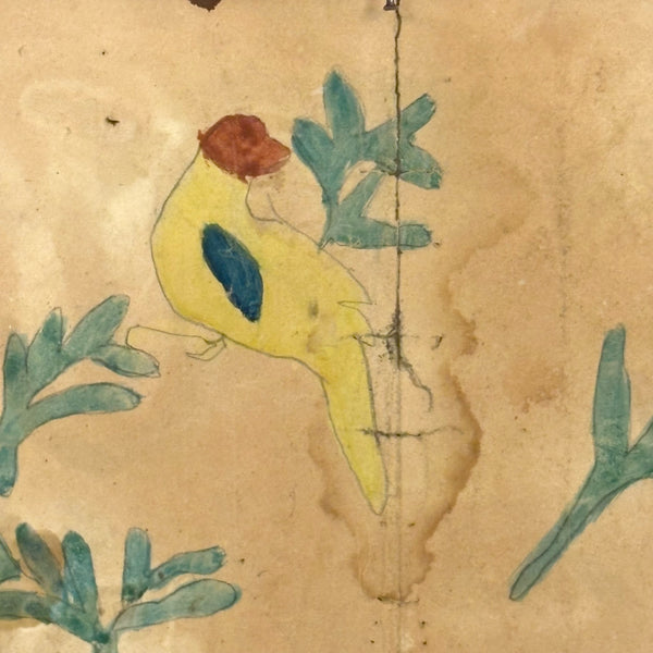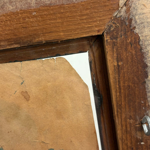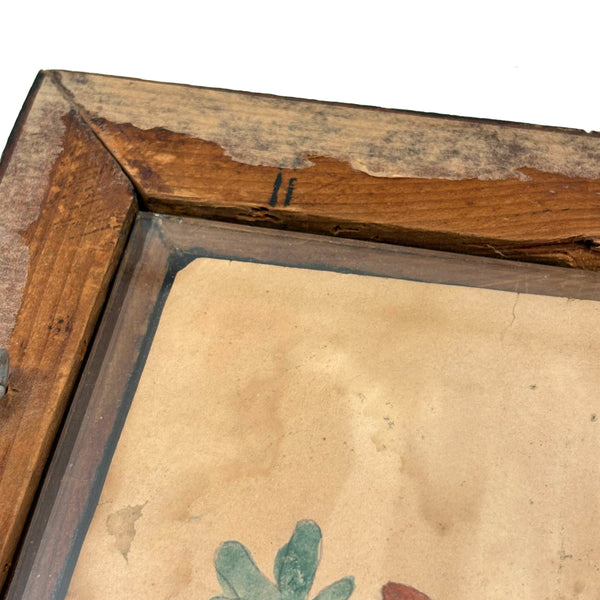 14 1/2" x 8 11/16" framed. Paper 11 1/2" x 6". Colors richer and more beautiful than photos well convey. Clearly the paper was a two page spread from a notebook, happily kept in tact. One (roughly cut) pane of glass seems original to this frame, and the second (cleanly cut) I believe added at a later date. Neither fits the frame exactly perfectly, but one nail at top and one at bottom on the reverse side are holding them in place well.