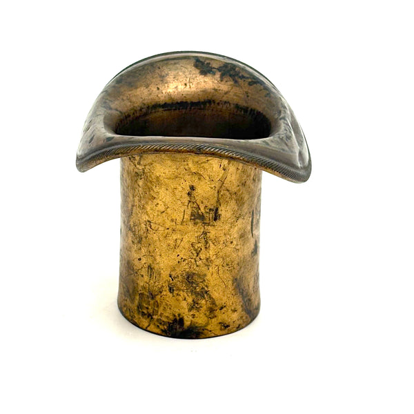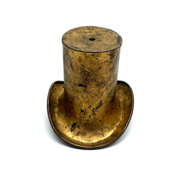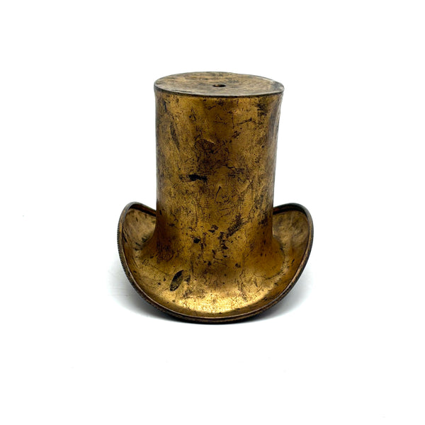 I spotted this in a case alongside of a smaller sterling silver top hat and an antique tole painted top hat shaped coin bank, so seems likely it was once part of a top hat themed collection. I love the form of it, and the detail around the brim, and luxe feeling true gold color, and it seemed right for the season we approach tipping our hat to the new year. There is a small hole at the center of the top, the purpose of which I don't know; I've seen old top hat-shaped spittoons, but not sure this is that--certainly one could stick a feather or a sparkler or a sprig of mistletoe in it!