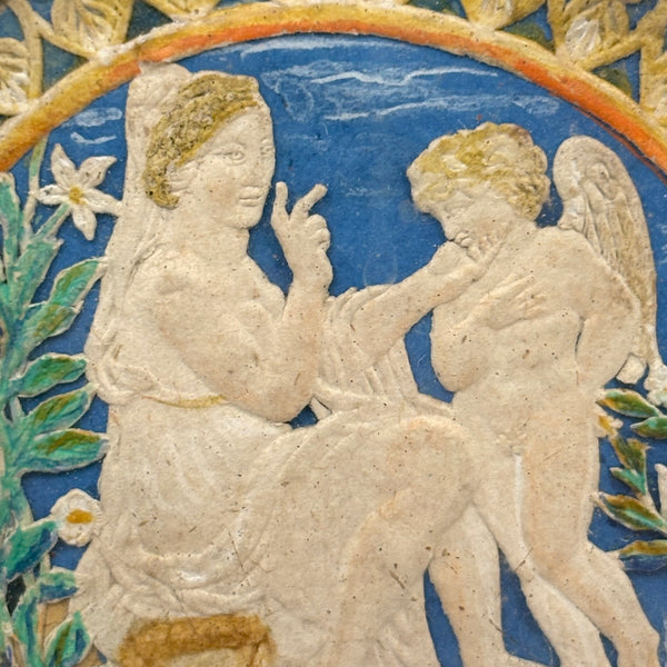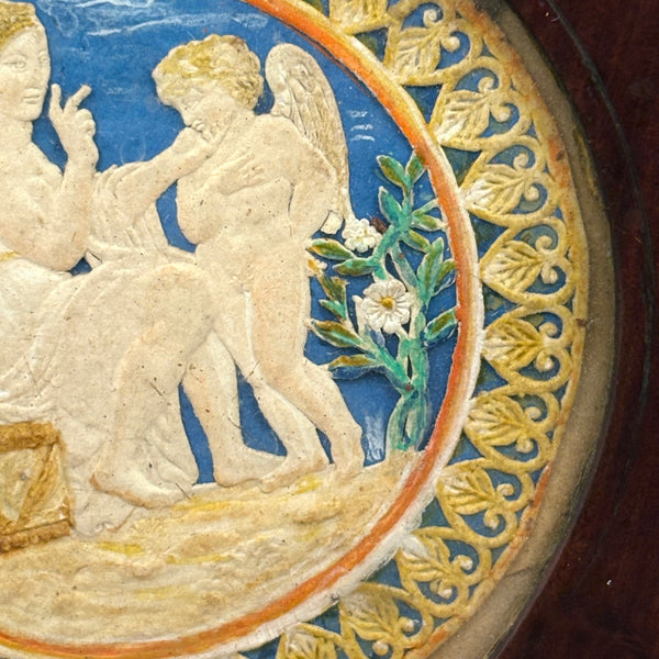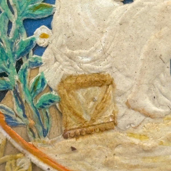 I find this really wonderful. It is embossed card, like an early paper lace valentine, hand-painted in the perfect blue and green and golds, making me think of Giotto frescoes! With goddess-like blonde winged angel at left, two fingers raised (signifying the dual nature of Christ, as both human and divine) and the other hand grasping the chin of her cherub companion. White lilies to either side of them and border of yellow painted hearts against blue ground framing them inside the carved wooden frame. Paper lace communion cards/holy cards were fairly common in the mid to later 19th century, but this is a different than those, c. 1840s I would guess, and somewhat more akin to a reliquary of that period. I'd call it a holy love token!