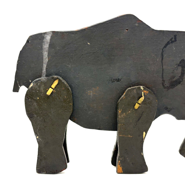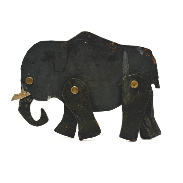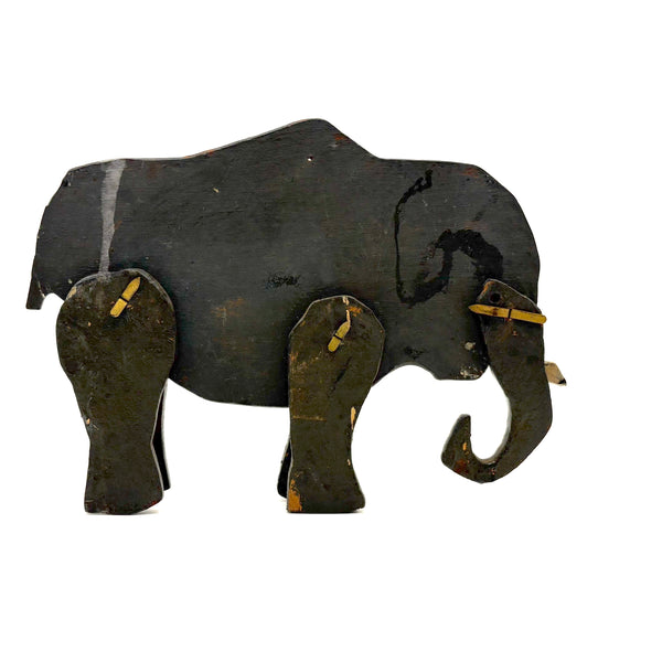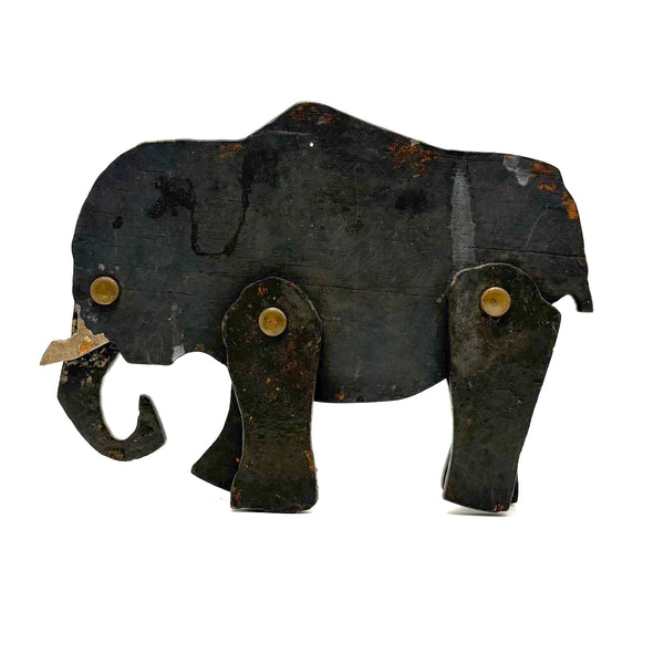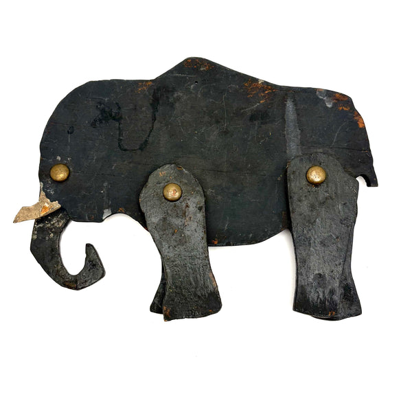 7 3/4" x 5 3/4" t. Perhaps a bit of loss to the tail and tusk but only more charming for it. Legs and trunk do move at the pinned joints, and it will stand on its own.