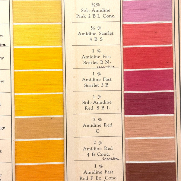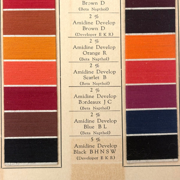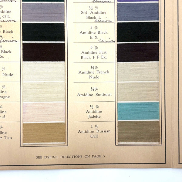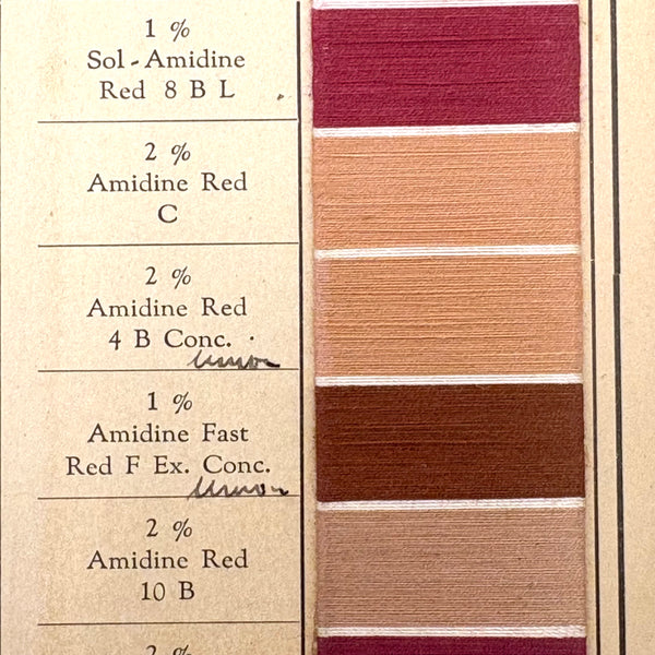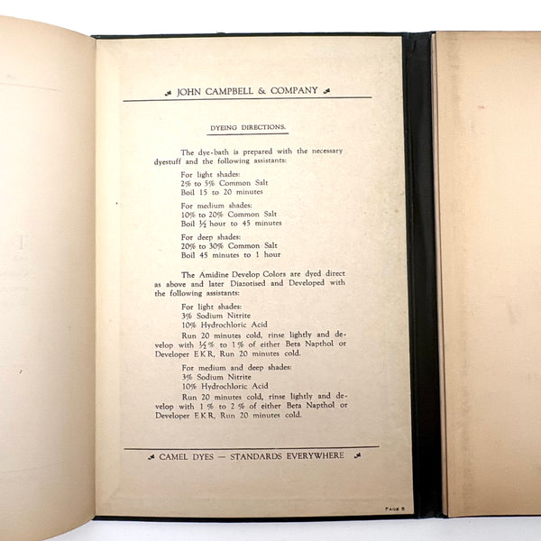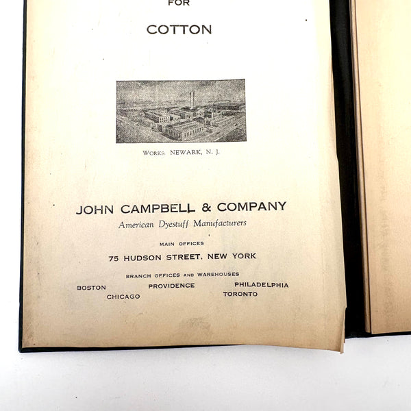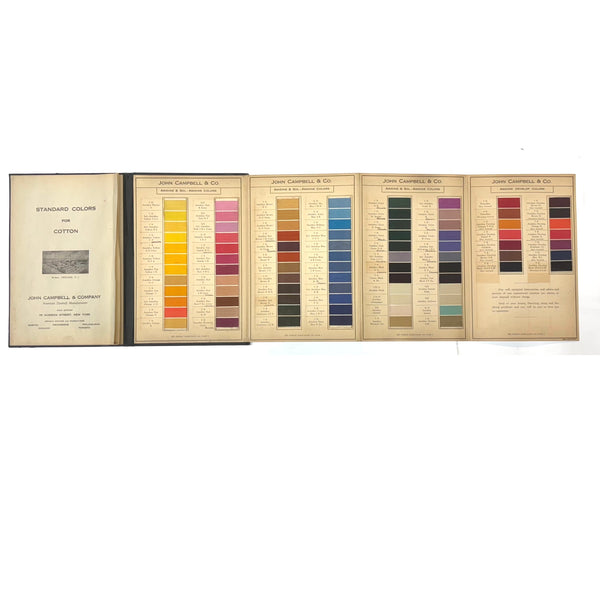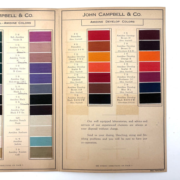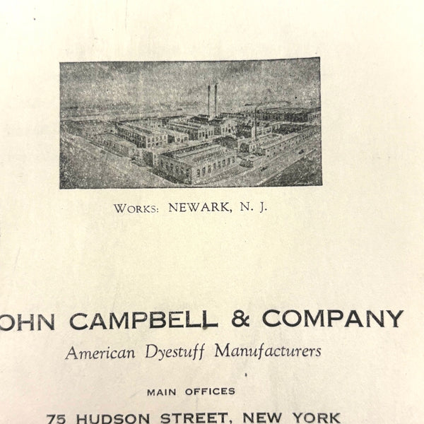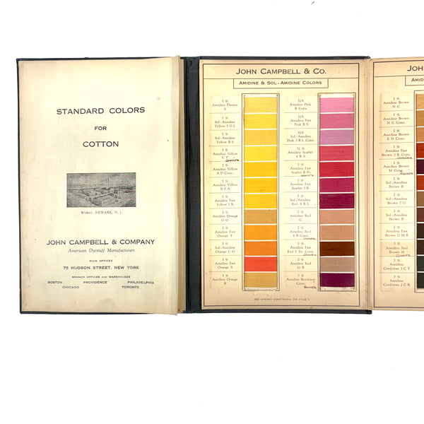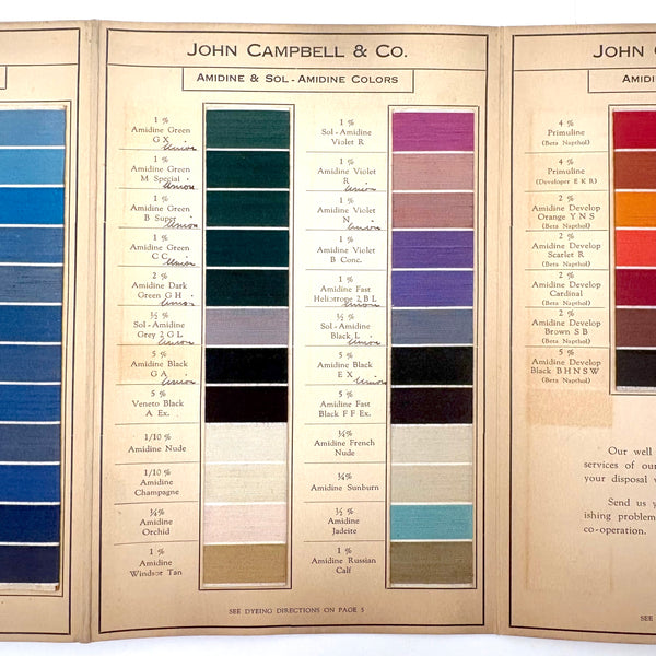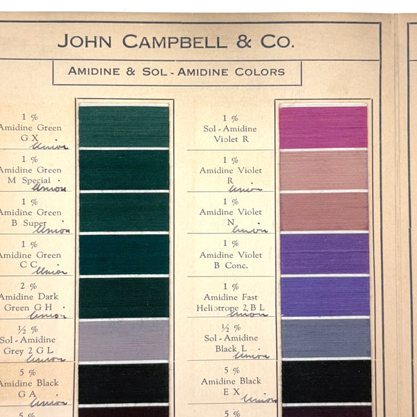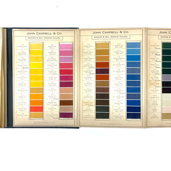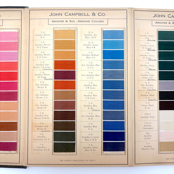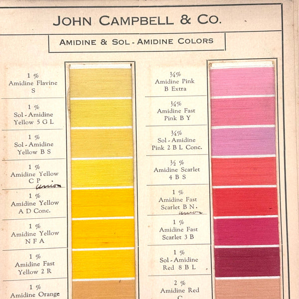 John Campbell Co. was established by its namesake in 1876, who came from England to establish the company, importing British dyes up to the time of his death in 1905. In 1907 the company was incorporated and went on to produce its own American dyes. I believe this color sample card dates to the 1910s-20s.