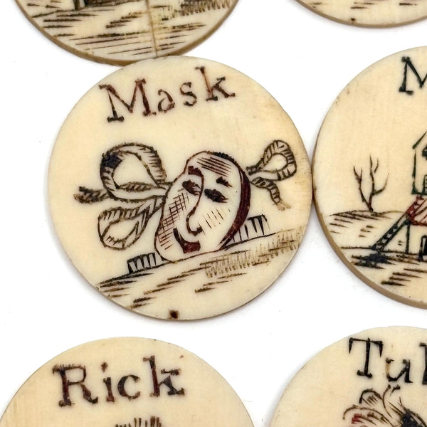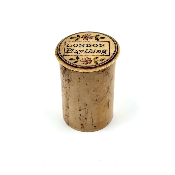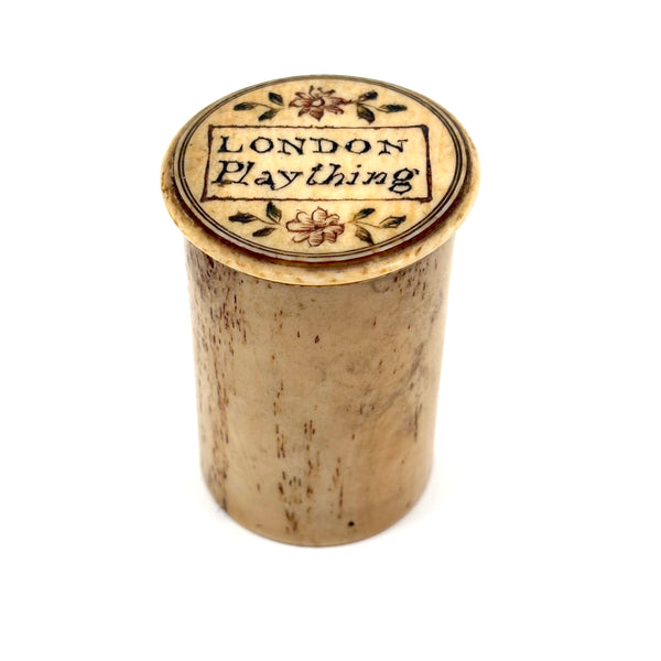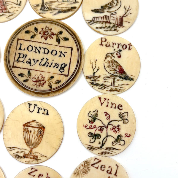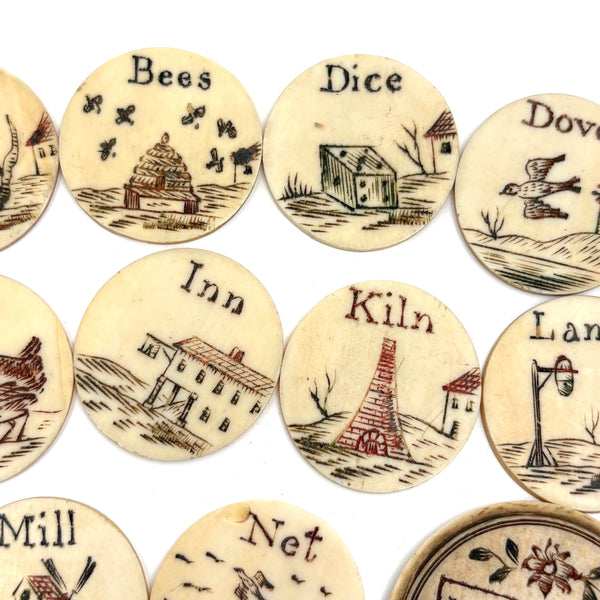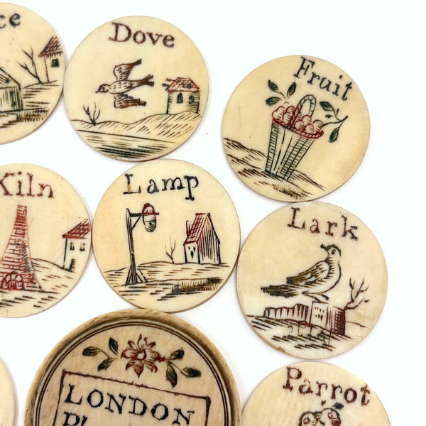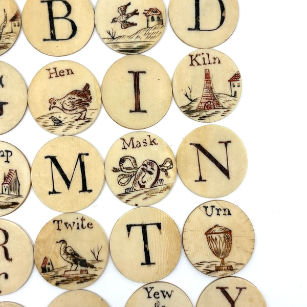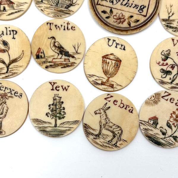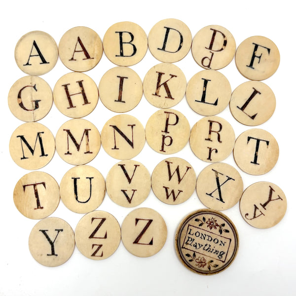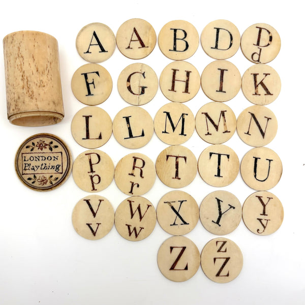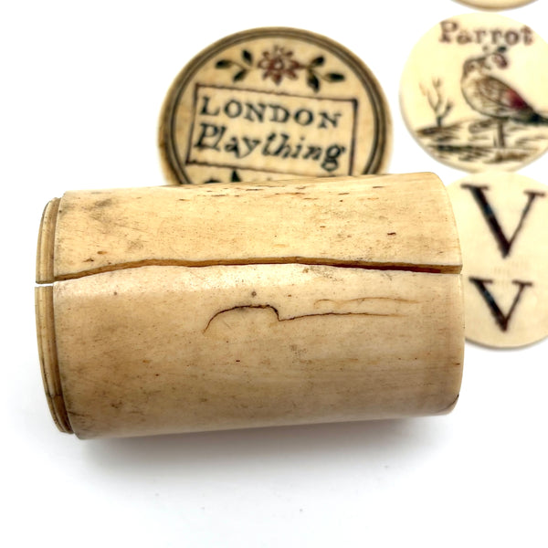 These make me very happy. I am always on the hunt for 19th century bone alphabets, used for teaching spelling and which have become quite precious, but I had never seen a set like this before. With some searching I've found one other set like it documented, housed in just the same sort of bone canister with screw top lid inscribed "London Plaything"--that set a complete uppercase alphabet on one side, and lowercase letters on the other (no pictures) and dated by the British auction house that sold it (for £520 in 2021) to the 1810s.