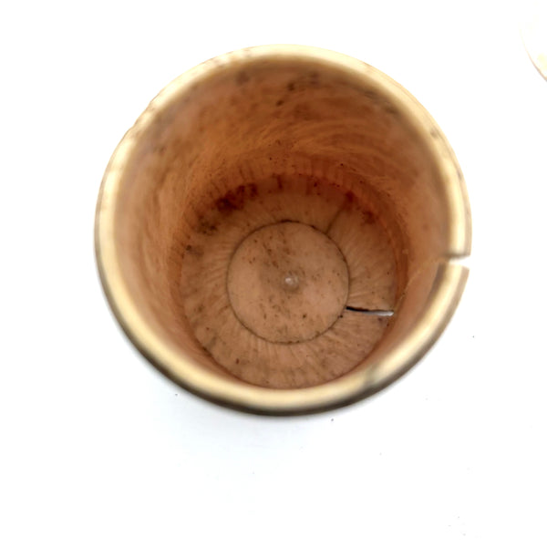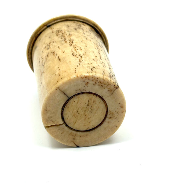Box 2 3/8" t x 1 5/8" d. Letters 1 3/16" d. As noted above, some letters missing, some doubly represented, but no redundancy on the picture sides.There is a split running down one side of the bone canister, as pictured, but it remains sound and the lid still screws on tightly and holds the letters just fine. One old repaired split down the center of the G, stable and sound now.